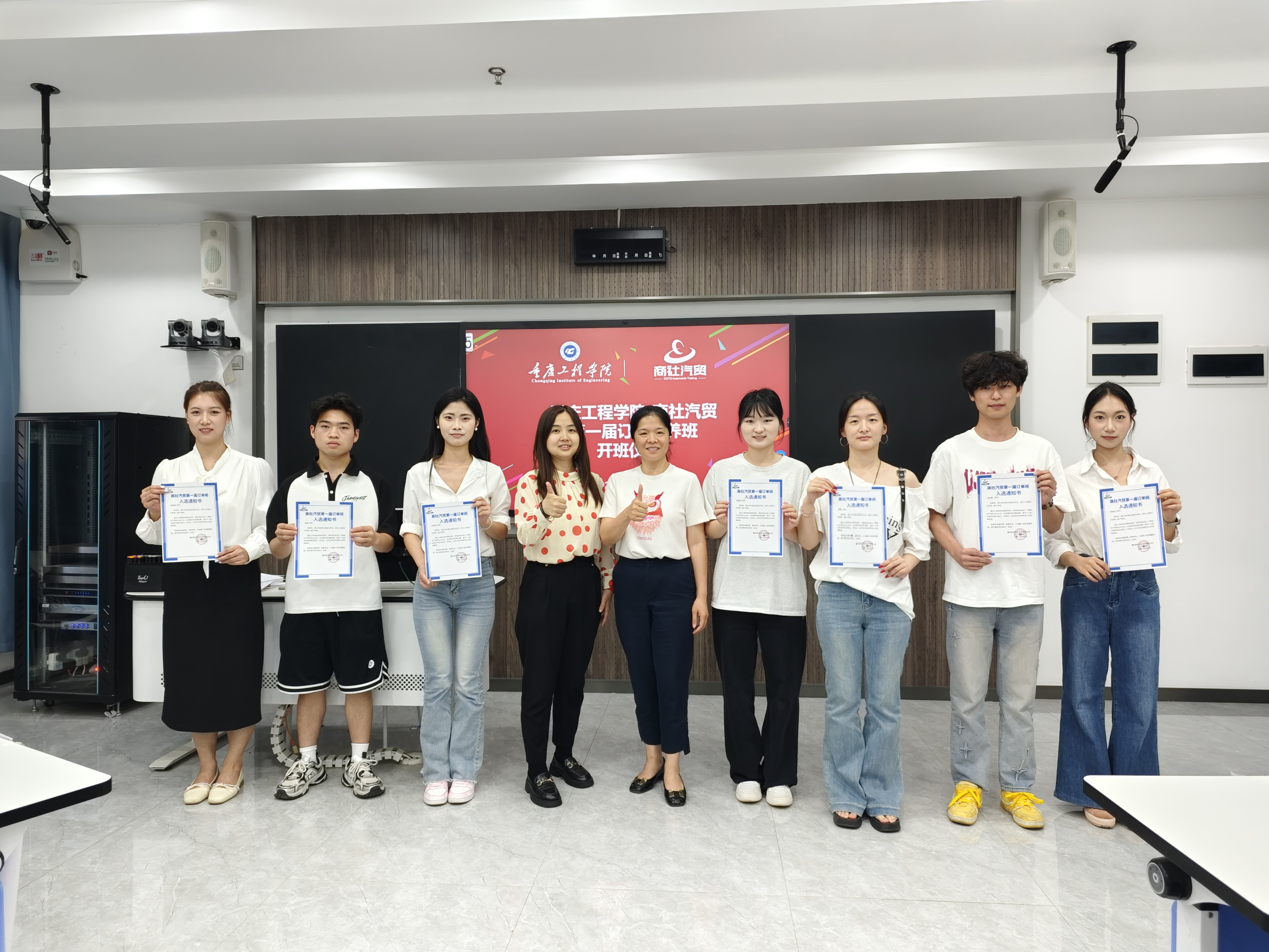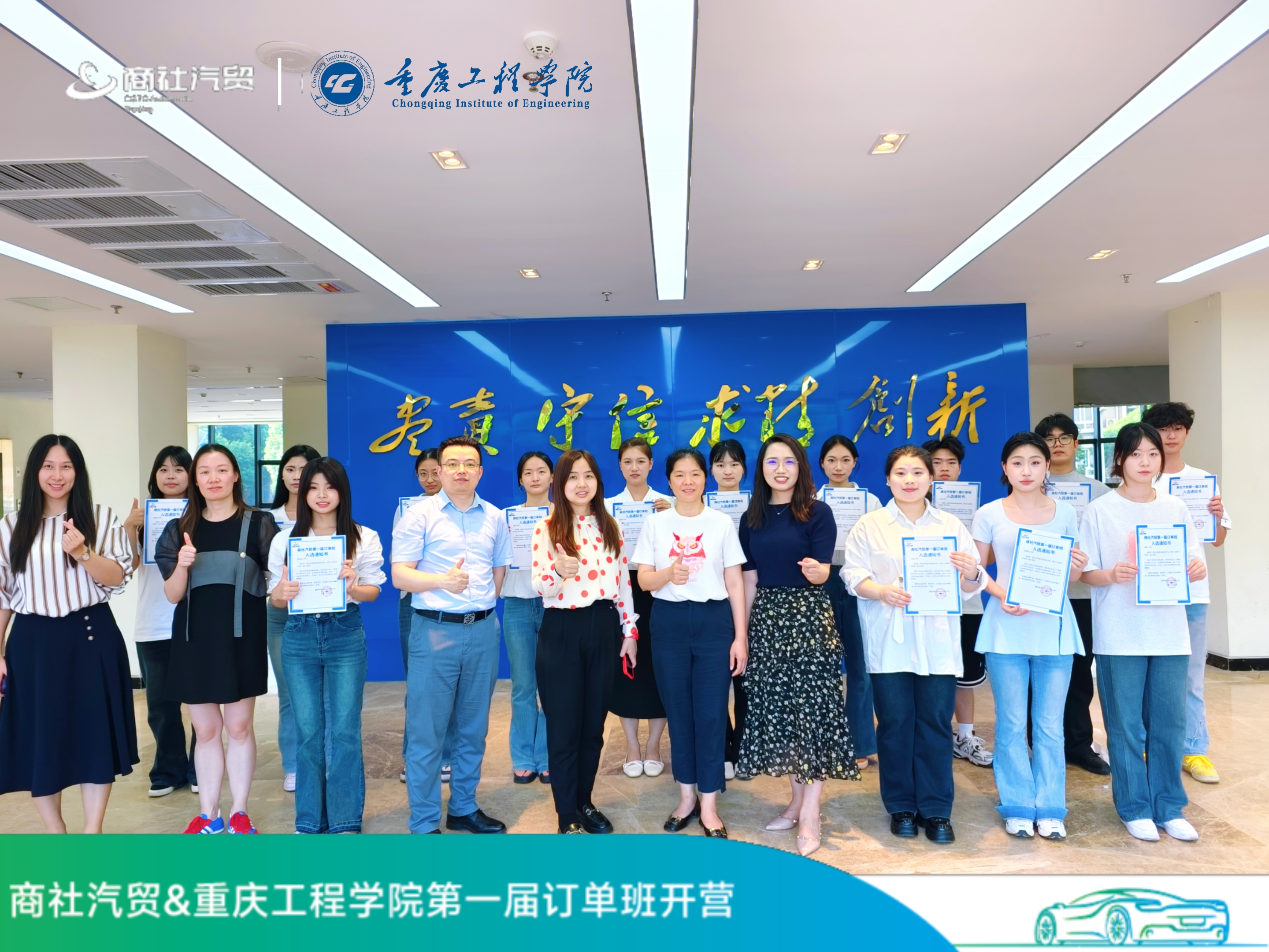 重庆商社汽贸(重庆百货600729全资子公司)是全国十佳汽车服务商,中国汽车经销商百强企业。公司旗下代理19个汽车品牌,形成“销售-用品-保险-金融-维修服务-二手车置换”全生命周期服务生态闭环。为帮助同学们更了解企业情况,快速融入企业,开班仪式结束后杨总、谭经理对学生们进行了关于企业品牌文化、职场沟通及汽车基础知识等相关内容培训。随后王总经理与朱主任共同颁发了订单班录取通知书,针对培训过程中表现优异的同学黄总颁发了优秀奖。