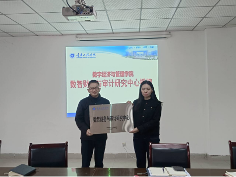 本网讯(图/文 孙攀琼)2025年12月17日13:00,数字经济与管理学院于3602会议室举行数智财务与审计研究中心成立暨授牌仪式。数智财务与审计研究中心成立旨在充分发挥数智技术在财务管理、审计监督、公司治理等领域的跨界赋能优势,提升学院在数智财务、智能审计领域的研究创新水平与社会服务效能,仪式上学院院长简玉刚为“数智财务与审计研究中心”授牌并讲话。简院长希望研究中心的成立能够更好地推动财务管理专业在学术研究、人才培养、社会服务、学术交流等相关工作的开展,持续提升学科专业内涵建设。