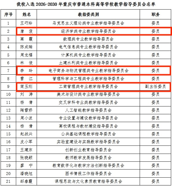 本网讯(文/图 左雪娇 学生党教中心)近日,重庆市教育委员会正式公布了2026-2030年重庆市普通本科高等学校教学指导委员会名单。经严格遴选,我院院长简玉刚教授、副院长李玲教授、数字经济系系主任唐菠教授成功入选。简玉刚担任工商管理类专业教指委副主任委员,李玲、唐菠分别担任电子商务与物流管理类、经济学类专业教指委委员。
