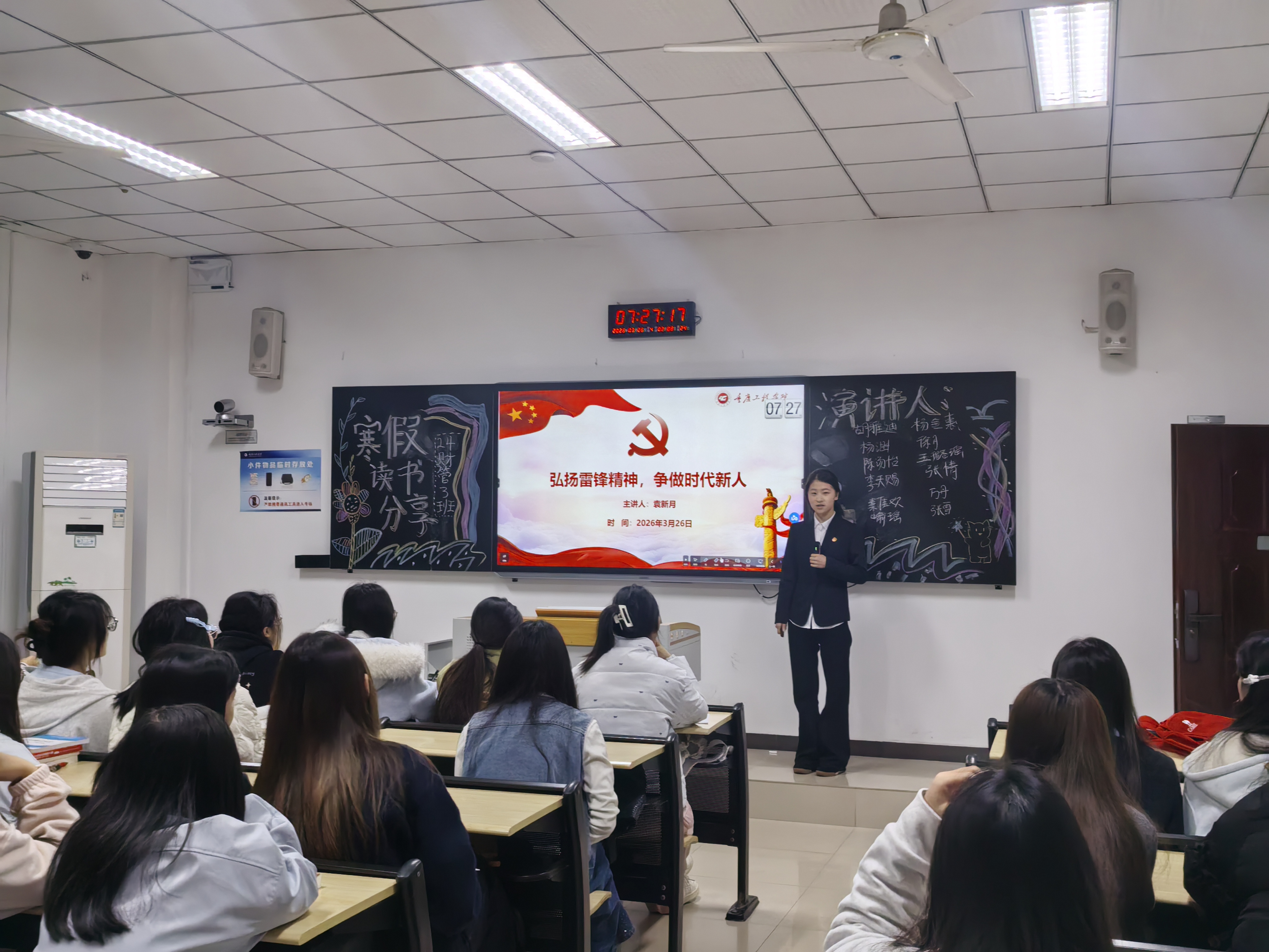 本网讯(文/鲁思雨 图/寇越 学生党教中心)为深入学习贯彻雷锋精神,传承中华民族优良道德风尚,切实培育新时代青年的责任与担当,3月26日上午,数字经济与管理学院党总支于第六教学楼开展“大学生微党课”进班级活动。本次活动由武小晗、袁新月等八名学生党员以“弘扬雷锋精神,争做时代新人”为主题进行宣讲。