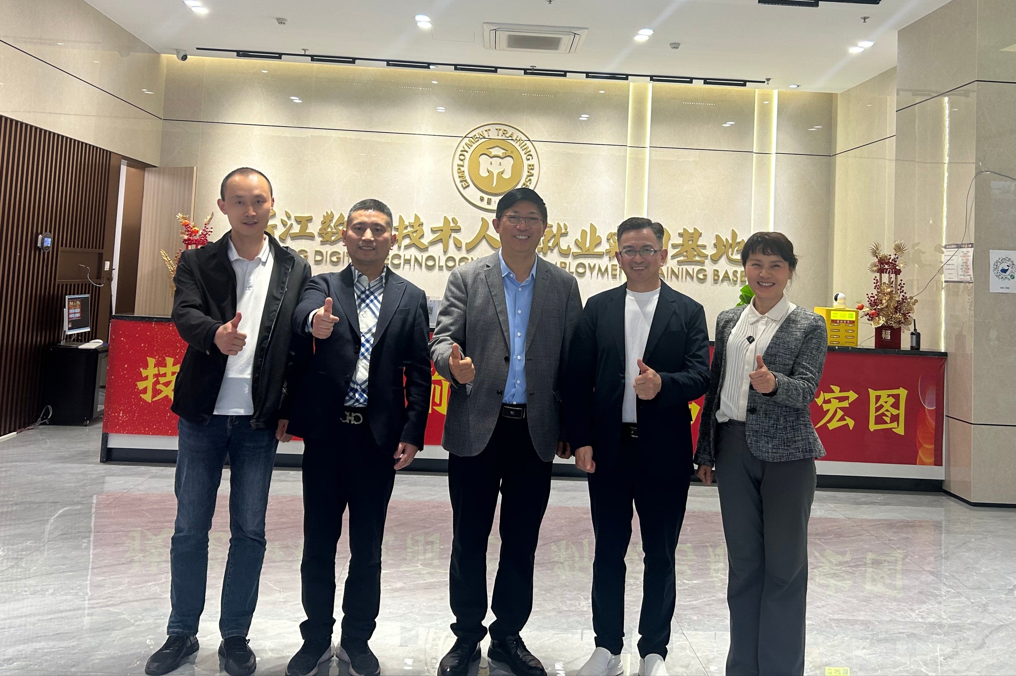 简玉刚一行赴浙江数字技术人才就业实训基地调研。基地合伙人张雪峰、潘颖靖等热情接待了简玉刚一行,并陪同参观了基地的数字技术实训中心、项目孵化区及就业服务专区。参观过程中,双方就如何通过“真项目、真环境、真压力”的实训模式提升学生就业竞争力进行了交流。简玉刚院长表示,此次调研为学院进一步明确数字经济专业定位、创新人才培养模式提供了宝贵借鉴。