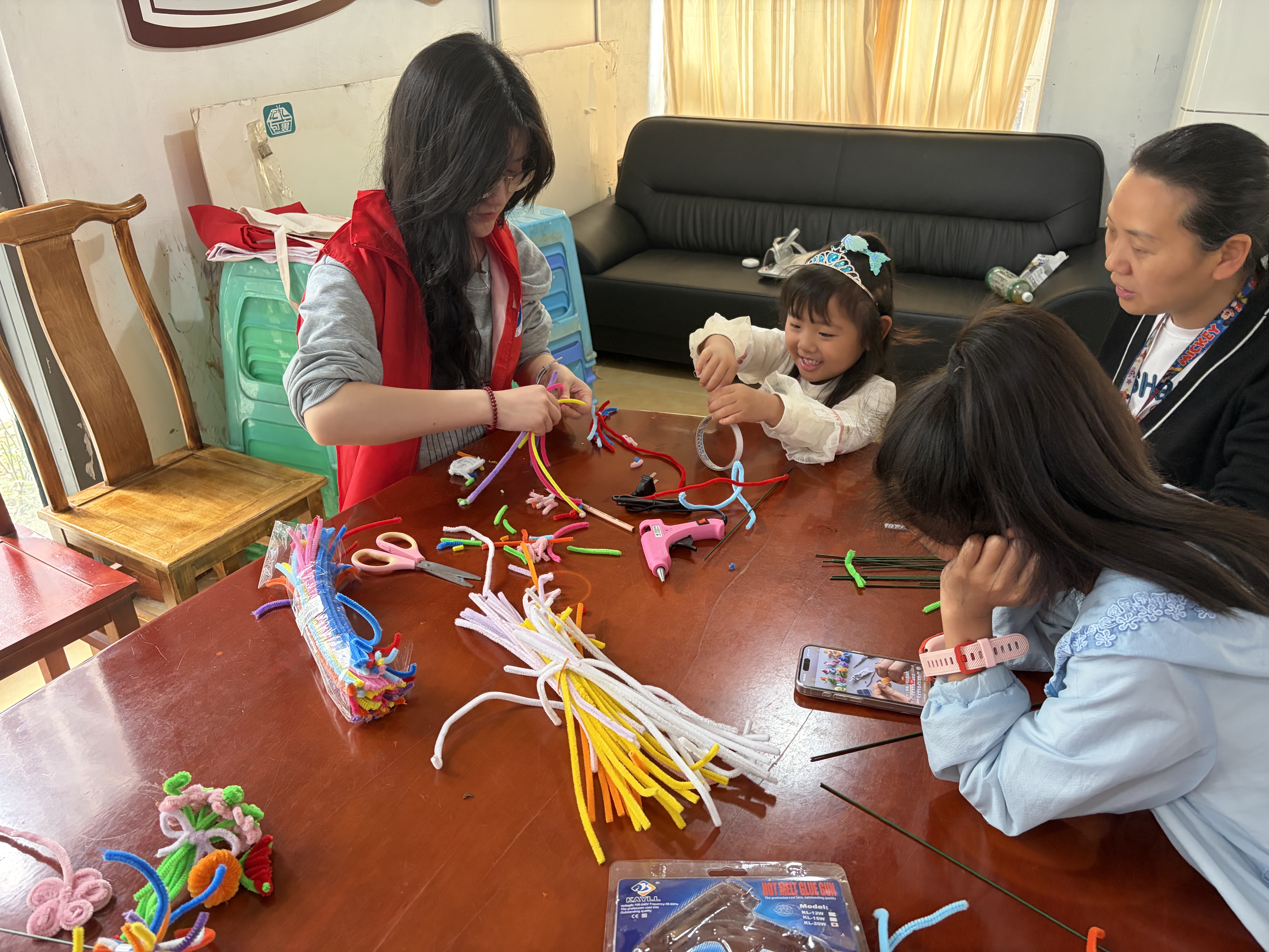 理论滋养心灵,实践启迪智慧。红色故事宣讲结束后,创意实践环节依次展开,现场氛围热烈而温馨。在扭扭棒创作时,志愿者们耐心讲解制作技巧,悉心指导每一位小朋友。笑声与惊叹声此起彼伏,在志愿者的引导下,孩子们用扭扭棒精心制作“英雄火炬”“红色五角星”“和平白鸽”“花朵”等造型,在轻松氛围中深化了对红色精神的理解,传递着对祖国母亲的热爱与祝福。