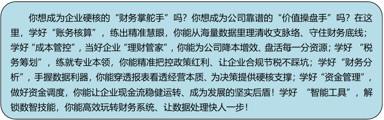 3.课证融通:课证融通人才培养模式,帮助学生在校期间考取初级会计师、初级审计师等证书。同时设立注册会计师方向班,聚焦注册会计师核心考点与行业实战能力培养,通过定制化课程体系、阶梯式备考规划、名师专项辅导与全真模拟实训,搭建从初级证书到高端执业资格的进阶通道,助力学生夯实专业基础、明晰职业路径,培养兼具证书竞争力与岗位适配力的高素质财会人才。