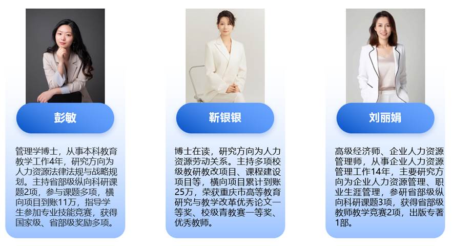 数字化人力资源管理、组织行为学、人才画像与素质测评、工作分析、培训与开发、智能招聘与甄选、绩效管理、薪酬管理、劳动关系与劳动法、商务数据分析 |