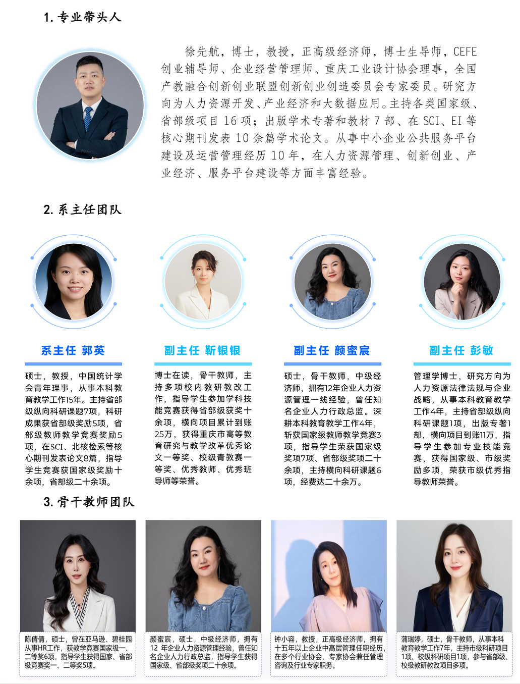 本专业面向西部,服务重庆区域经济与社会发展,适应人工智能时代社会经济数字化发展对人力资源管理高级专门人才的新需求,掌握管理学、经济学、市场营销学、统计学、会计学等基础理论,具备人力资源规划、智能招聘与甄选、培训与开发、绩效与薪酬管理、员工关系管理等专业知识和实践能力,具有良好的职业道德、职业素养、法律意识、创新意识与社会责任感的高素质应用型人力资源管理专门人才。