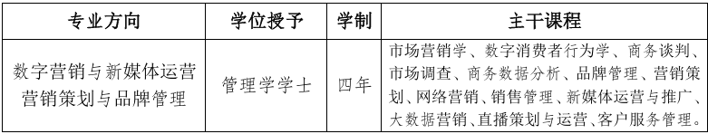 本专业面向西南,服务重庆区域经济与社会发展,培养德智体美劳全面发展,适应数字经济时代企事业单位对数字营销人才需要,掌握必备的管理学、市场营销学等基础理论知识,以及市场调查、商务数据分析、营销策划、网络营销、新媒体运营与推广、客户服务等专业知识,具有市场调查、营销策划、市场开发、销售管理、数字营销推广、客户服务等实践能力,具备创新意识、职业道德素养和社会责任感的高素质应用型专门人才。毕业生可在企事业单位从事市场调查、营销策划、市场开发、销售管理、数字营销推广、客户服务等工作。