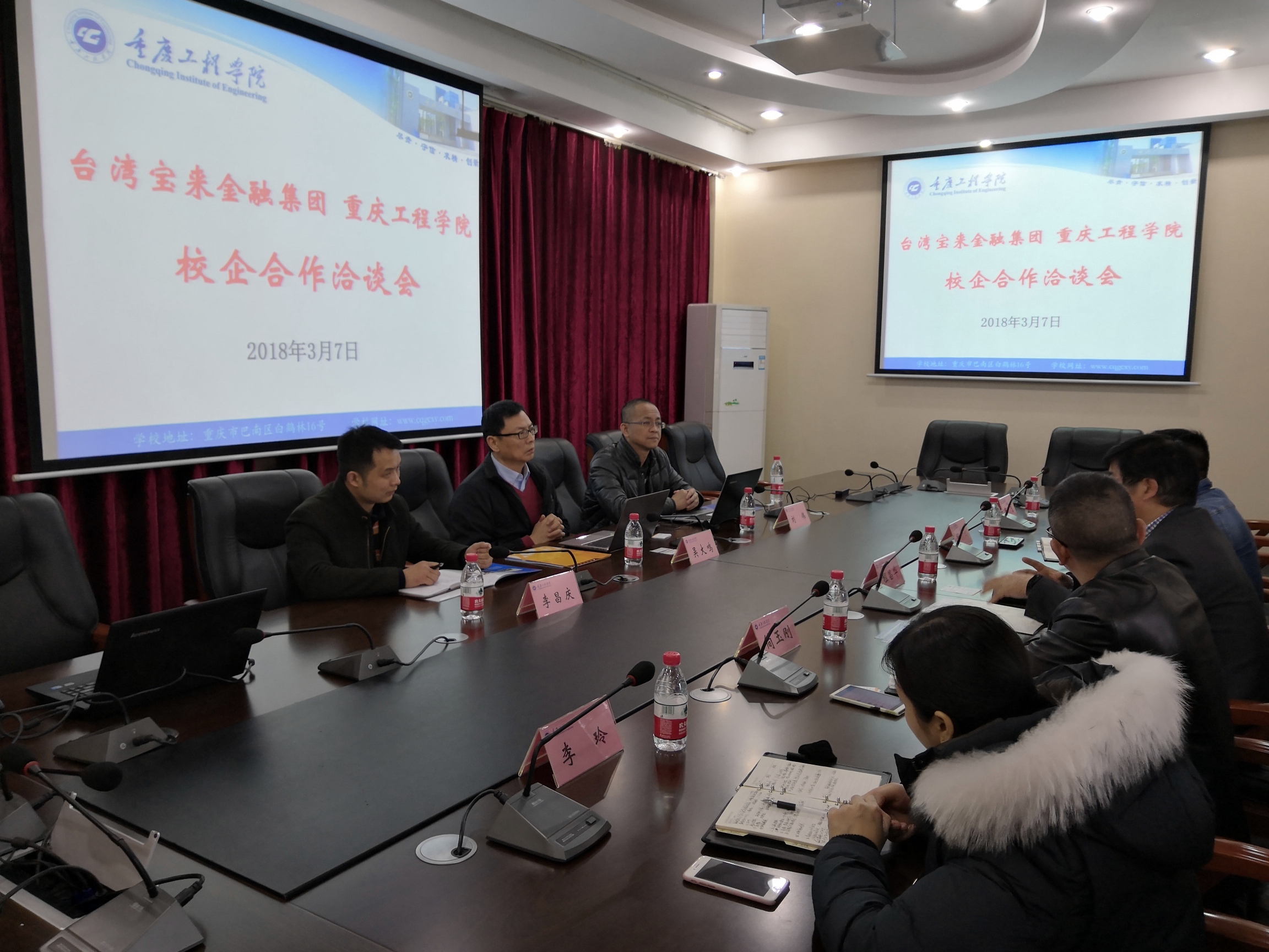 2018年3月7日,台湾宝来金融集团金融系统事业群副总吴大鸣、宝来中国人才服务商重庆星空国际总经理李昌庆、宝来华东合作校区总经理刘伟一行3人到访我校,与管理学院就校企合作项目展开洽谈。我校出席本次洽谈会的有程昌华校长、管理学院简玉刚院长、管理学院李玲副院长、管理学院邹均书记和管理学院实习实训中心陈可主任。