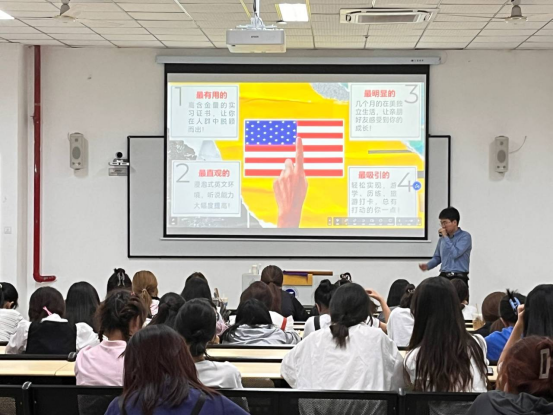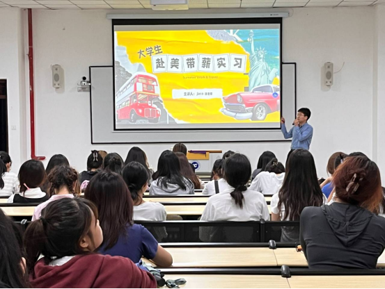 宣讲会开始,徐老师首先对暑假赴美带薪项目做了简单的介绍。赴美带薪项目(Summer Work & Travel USA),简称SWT项目,是美国政府核准的国际青年学生交流活动之一。 学生利用暑期时间持J-1交流访问学者签证在美开展社会实践锻炼,旨在为学生提供海外社会实践历练的机会,扩大国际视野,助推未来高端就业和海外再深造。宣讲中,徐老师着重介绍了实习岗位、生活保障、相关费用、申请条件及流程等问题。最后,徐老师鼓励同学们通过这一项目,扩大国际视野,感受异国文化,为自己的人生增添浓墨重彩的一笔。
