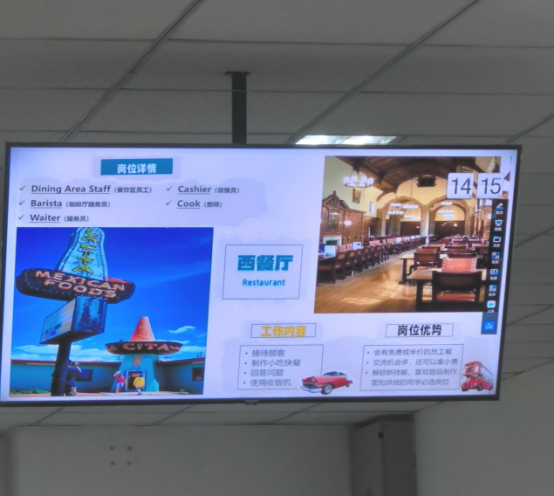 说明会上徐老师先给同学们科普了有关美国的知识,由此引出此次活动主题。接着徐老师重点介绍了项目特点和岗位类型。该项目除了签发J-1签证外,还具有多样性、灵活性、安全性、政府性等特点;带薪实习项目可以选择的岗位很多,有西餐厅、超市、游乐场等。同时,徐老师温馨提示大家应当根据自身情况选择合适岗位类型进行英语的提升、海外实习经验的积累。最后,说明会在学长学姐的感悟视频中温馨地结束。