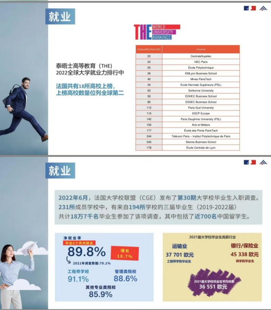 会议关于大家最关心的方面——就业,林老师做出了更为详细的讲解。林老师提到法国留学对同学们就业而言是有极大优势的。2022年泰晤士高等教育(THE)全球大学就业排行中法国18所高校上榜,位列全球第二。同时,2021年毕业6个月内净就业率高达89.8%,2021届大学毕业生平均年薪36551欧元。可见法国留学为同学们提供了一个更为广阔的就业天地,供同学们施展拳脚。