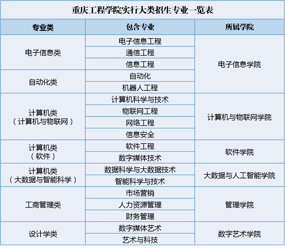 近日,重庆市教育委员会正式批复我校《重庆工程学院关于从2021年起部分专业按专业类招生的请示》(渝工程院文〔20216号),同意我校自2021年起,对电子信息类(含电子信息工程、通信工程、信息工程专业)、自动化类(含自动化、机器人工程专业)、计算机类(计算机与物联网)(含计算机科学与技术、网络工程、信息安全、物联网工程专业)、计算机类(软件)(含软件工程、数字媒体技术专业)、计算机类(大数据与智能科学)(含智能科学与技术、数据科学与大数据技术专业)、工商管理类(含市场营销、财务管理、人力资源管理专业)、设计学类(含数字媒体艺术、艺术与科技专业),总共7个大类、18个本科专业实行专业类招生。