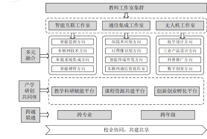 在建立教师工作室群时,通过企业走访调研,确定工作室的主要任务和目标,支撑学科方向,聚焦人才培养。结合学院学科专业情况,确定工作室主要技术研究方向,智能互联工作室以电子信息工程专业为依托,主要集中在智能监测、智能硬件、车联网应用方向;通信集成工作室以通信工程专业为依托,主要集中在AI图像处理、智能终端开发、通信优化等方向;无人机工作室基于科普+应用,集中在航空模型设计、科普推广等方向。