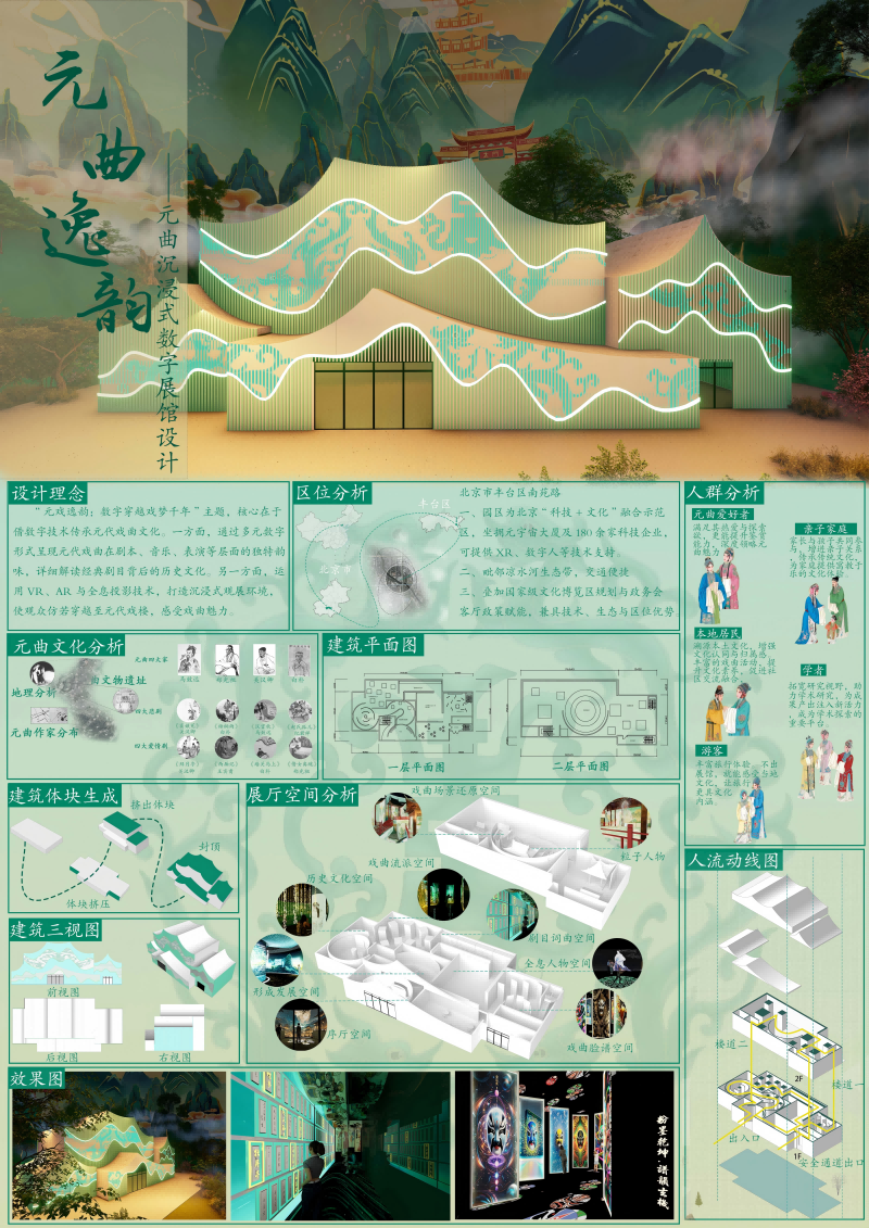 其中,李璐珈团队的《元境・游园录》、向涛团队的《元戏逸韵:数字穿越戏梦千年》、向鸿飞团队的《大唐军神》3 件作品斩获全国一等奖 。《元戏逸韵》以数字技术构建沉浸式戏曲体验空间,让观众“穿越”千年感受传统戏曲魅力《元境・游园录》则以元宇宙理念重构古典园林,实现传统文化与前沿科技的深度融合,充分契合大赛 “培养未来设计师” 的核心目标。
