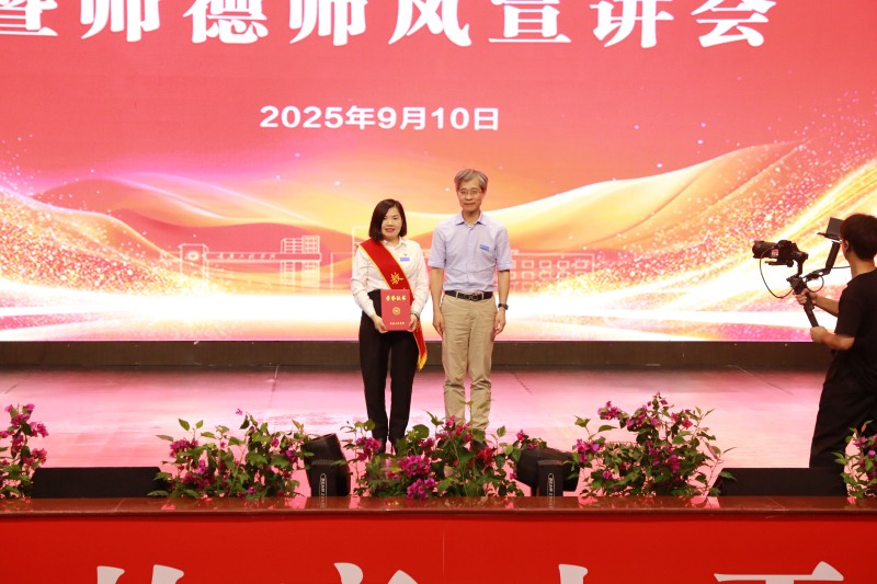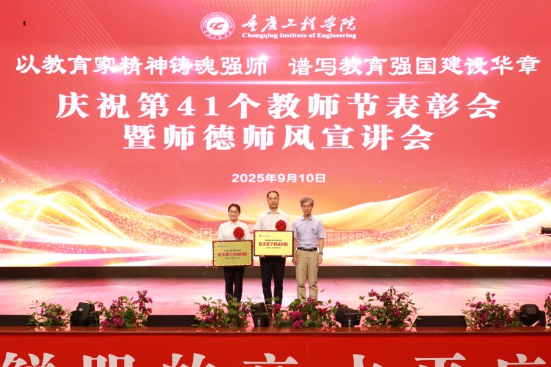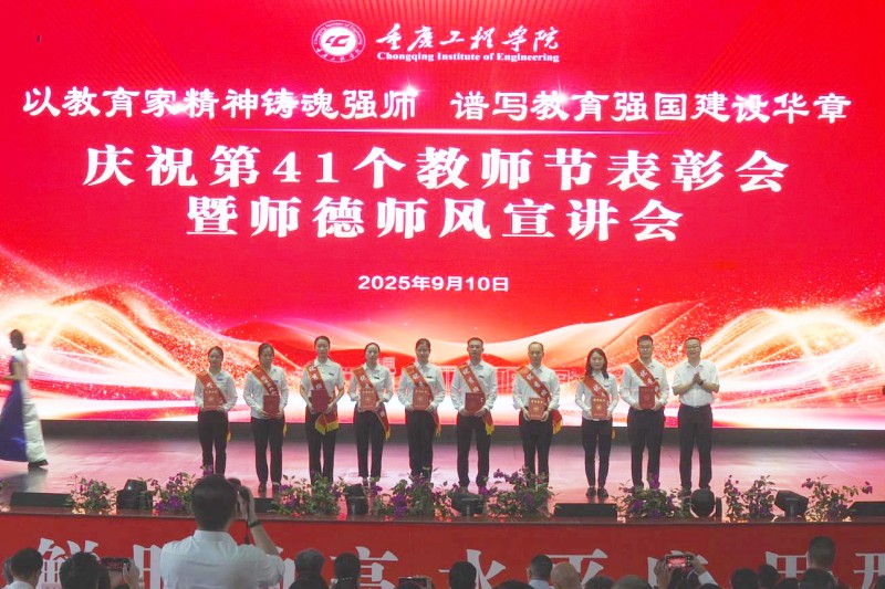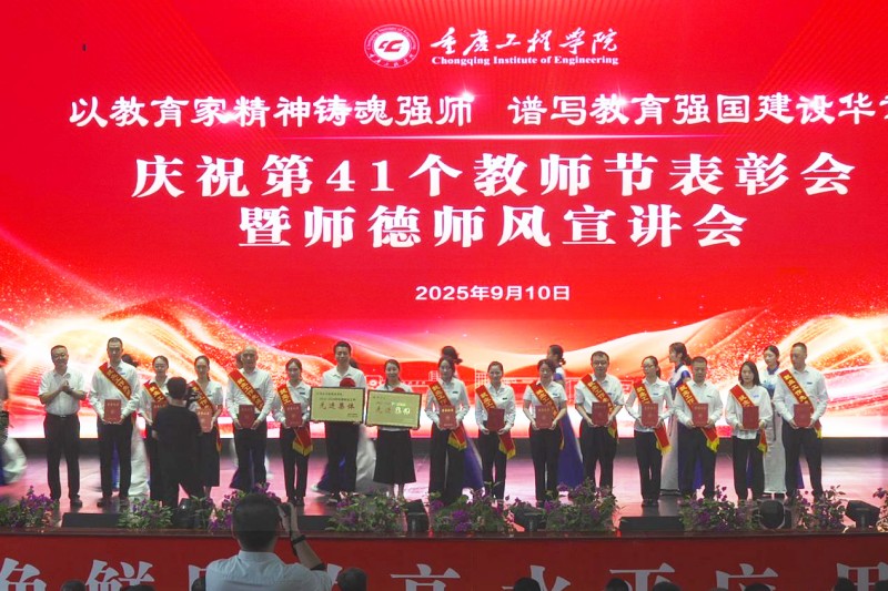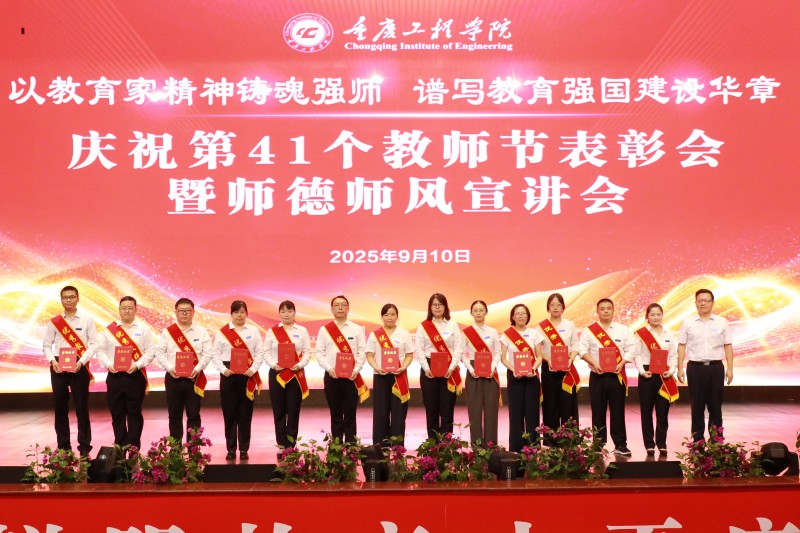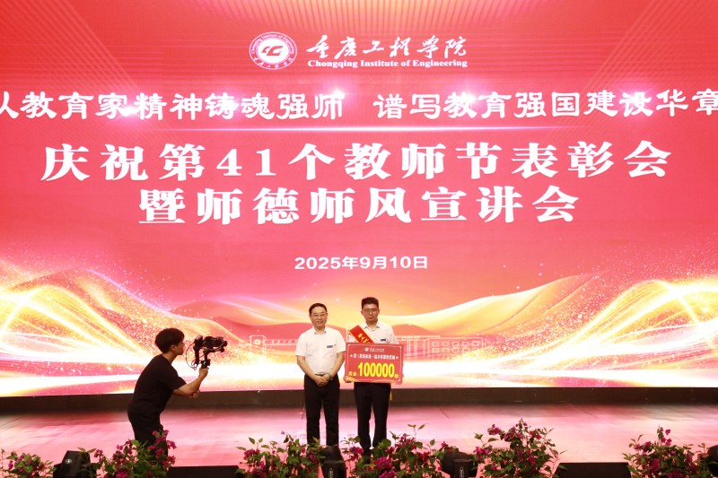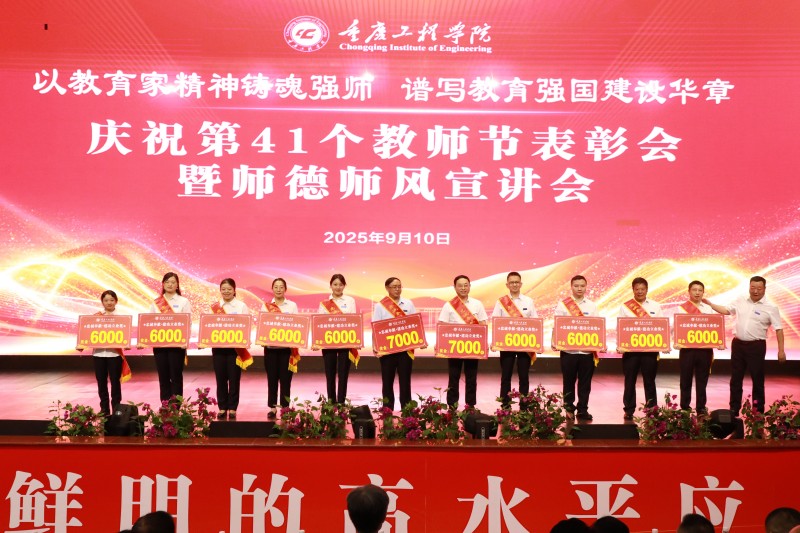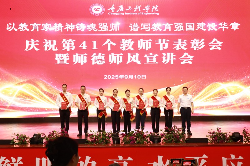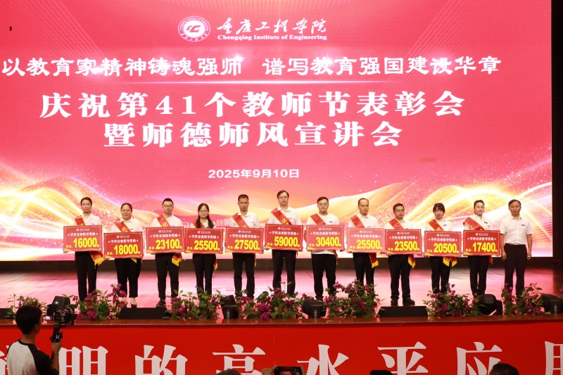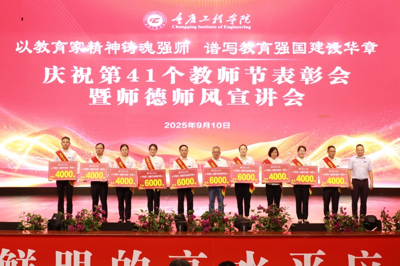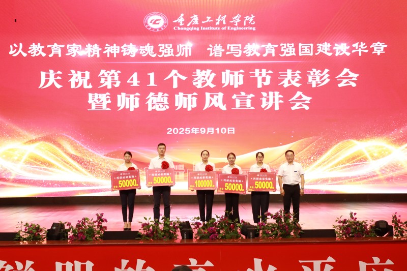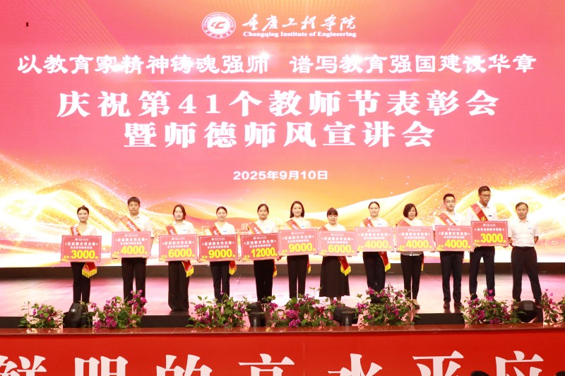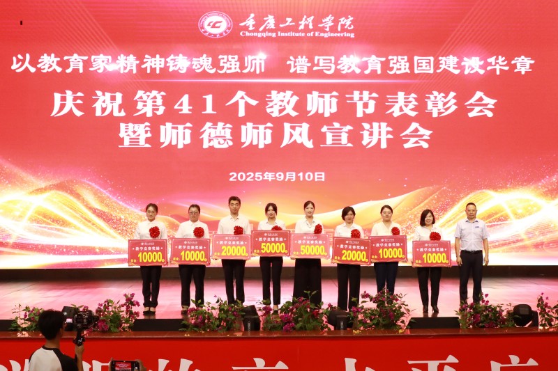 2025年,重庆工程学院涌现出一批又一批在各自的岗位上扎实工作,崇德修身,潜心育人,追求卓越,甘于奉献的优秀教师,他们以实际行动践行教育家精神,伴随着催人奋进的音乐声,老师们踏步走上舞台,学校领导为获奖教师代表颁发荣誉证书和奖金。