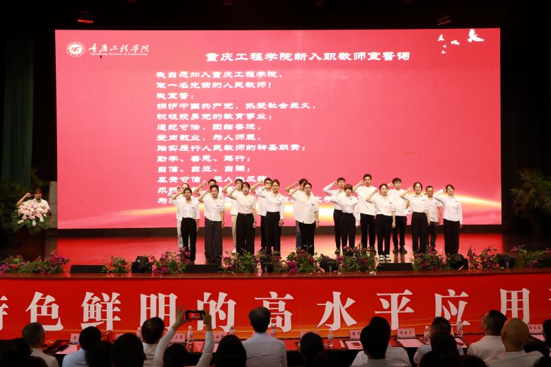 随后,2025年新进教职工代表集体宣誓,他们用铿锵有力的誓言,许下了对教育事业的忠诚与坚守,表明了为建设特色鲜明的高水平应用型大学,为培养德智体美劳全面发展的社会主义建设者和接班人接续奋斗的决心。