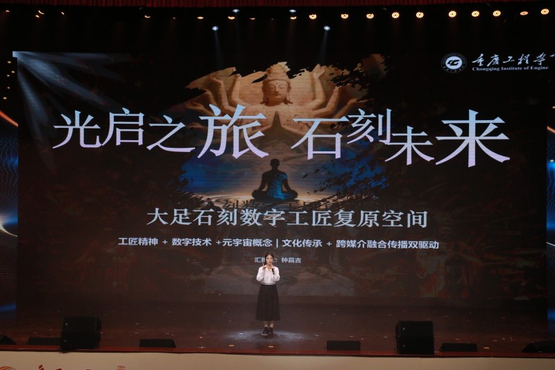 展演中,短视频、动画、AI数字创意赛道优秀作品展播依次登场,让观众沉浸式感受文物的青春表达。四川外国语大学几内亚留学生覃月分享短视频一等奖作品《渝境漫游记:非洲姑娘的重庆文化解码》创作心得;西南政法大学鲁雨静解读动画作品《跨越千年的对望》的文化内涵;重庆建筑工程职业学院教师白旭则以《如果文物也有MBTI》展现AI赋能文物的创新魅力。我校学生团队创作的动画《光启新之旅、石刻未来》作为特色作品亮相,以大足石刻为核心,勾勒传统与未来的对话图景。