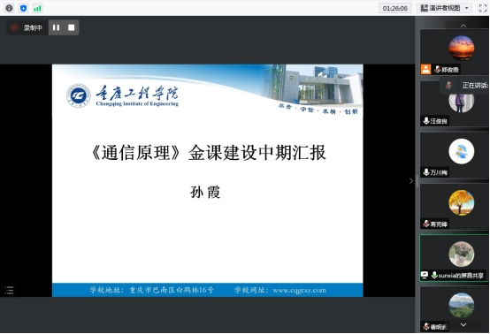 11门2021年立项校级线下“金课”建设项目的负责人依次以PPT形式进行了中期检查汇报解说,并分别接受了专家问询和指导。整体看,经过1年的建设,校级线下“金课”的课程资源已基本建设到位,但在内涵挖掘、特色展示、方法创新上,还有待进一步提高。其中,张正龙老师《面向对象程序设计(Java) 》课程中思政元素的融入方式、 万川梅老师《NoSQL数据库 》课程中校企合作方式、刘香香老师《工程经济学》课程中多学科融合的内容设计、孙霞老师《通信原理》课程的整体设计思路,均有一定的思考和创新,对开展课程建设有一定的参考价值。