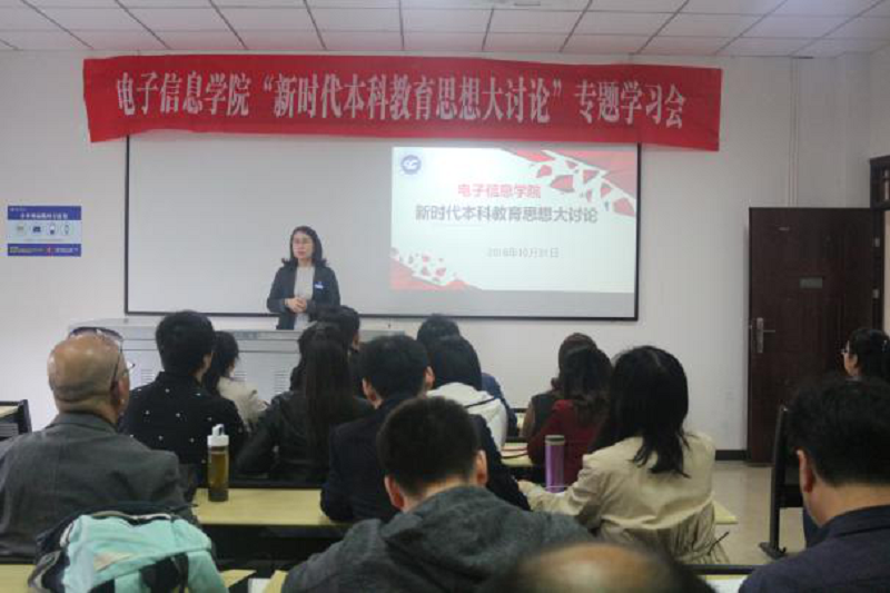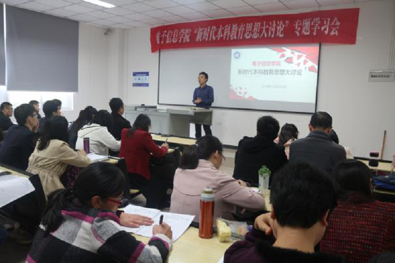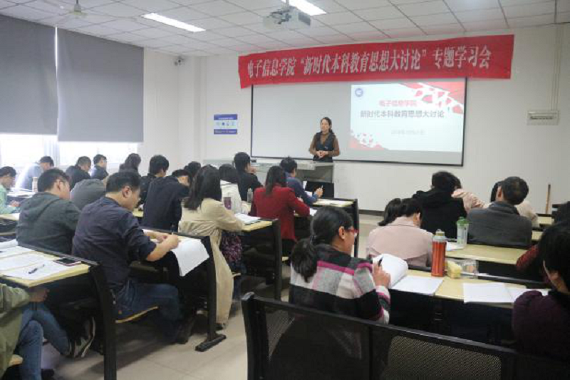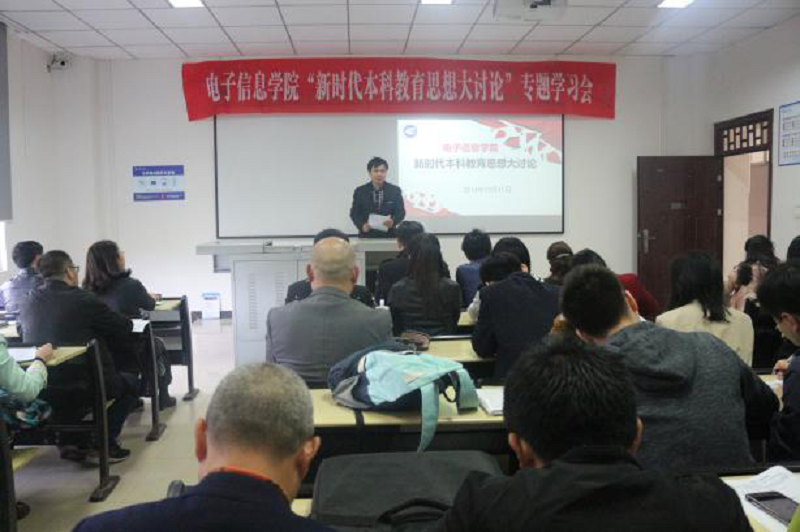 本网讯(文/元未霞、大学生记者团)为贯彻落实全国教育大会精神,进一步提高人才培养质量,以优异成绩迎接本科教学合格评估,根据学校相关工作要求,10月31日下午,电子信息学院在六教6120教室,举行“新时代本科教育思想大讨论”专题学习会。
