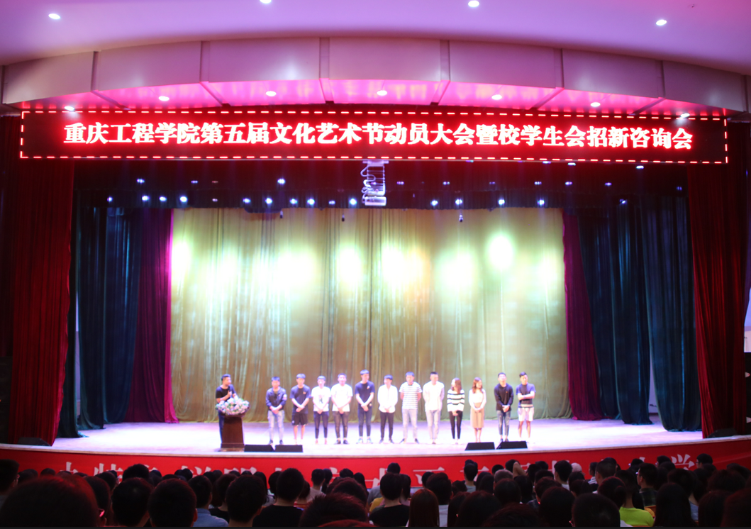 本网讯(校学生会宣传部 文/韩湘 图/周广) 2018年9月9日星期日晚20:30,在学术报告厅顺利召开了第五届文化艺术节动员大会暨校学生会招新咨询会,出席本次大会成员有:重庆工程学院校团委副书记黄涛、学生会主席团、各职能部门干部以及2018学生会部门拟应聘成员。