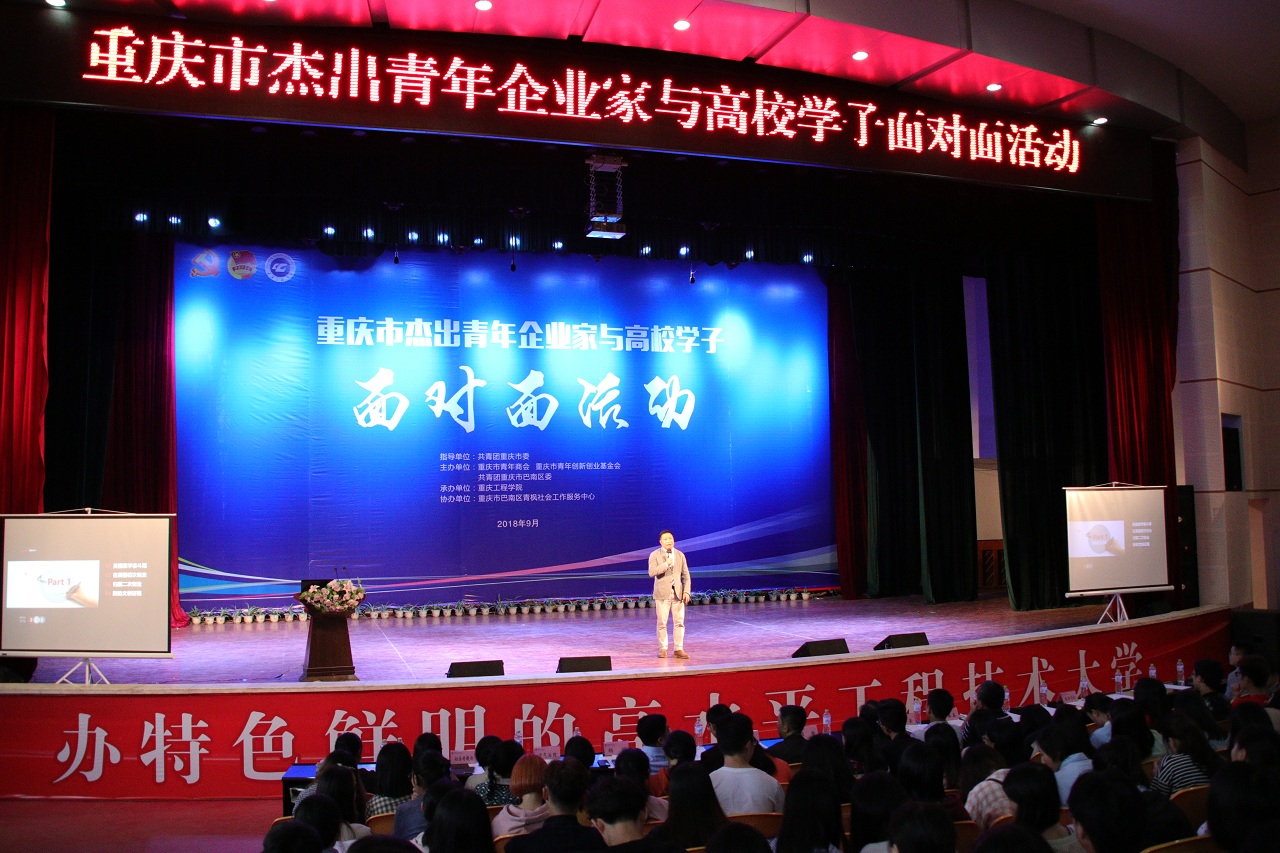 “重庆市杰出青年企业家与高校学子面对面”作为共青团重庆市委促进青年创新创业工作一项品牌活动,目的是为积极弘扬渝商精神,搭建重庆优秀青年企业家与高校学子面对面交流的平台,让青年企业家们通过分享自身创业经历、传递宝贵经验,引导青年大学生树立创新创业意识,正视创业、理智创业。“重庆市杰出青年企业家”评选是经市委、市政府批准设立的全市性社会组织评比达标表彰常设项目,由重庆市青年商会组织实施。此次“面对面”活动邀请的嘉宾,即是今年9月获评“2017年度重庆市十大杰出青年企业家”的其中两位。