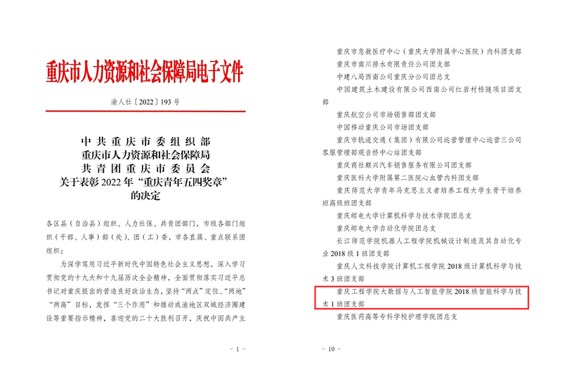 本网讯(文/图 大数据学院)近日,市委组织部、市人力社保局、团市委联合印发《关于表彰2022年“重庆青年五四奖章”的决定》,我校大数据与人工智能学院2018级智能科学与技术专业1班荣获“五四红旗团支部”荣誉称号。