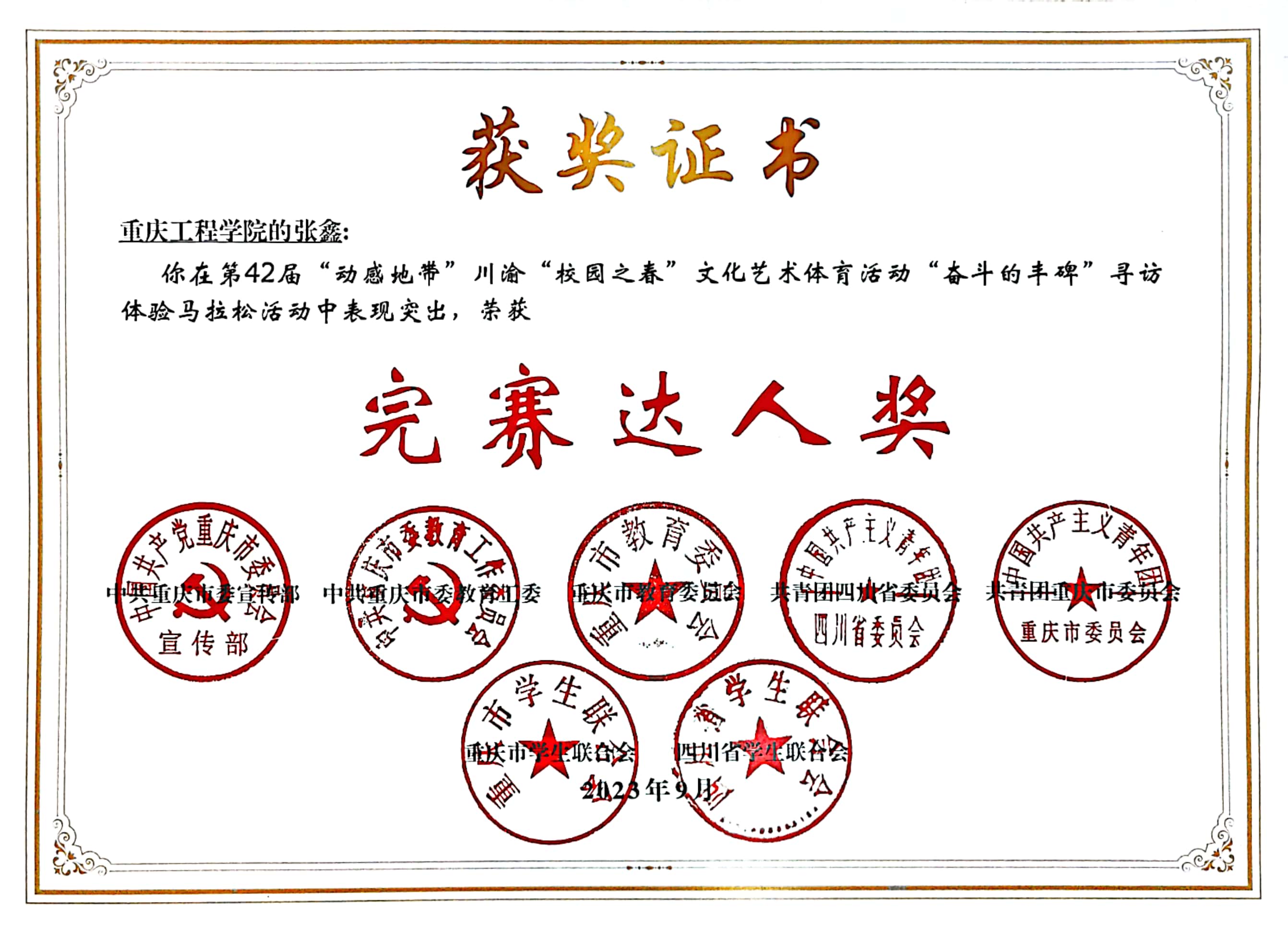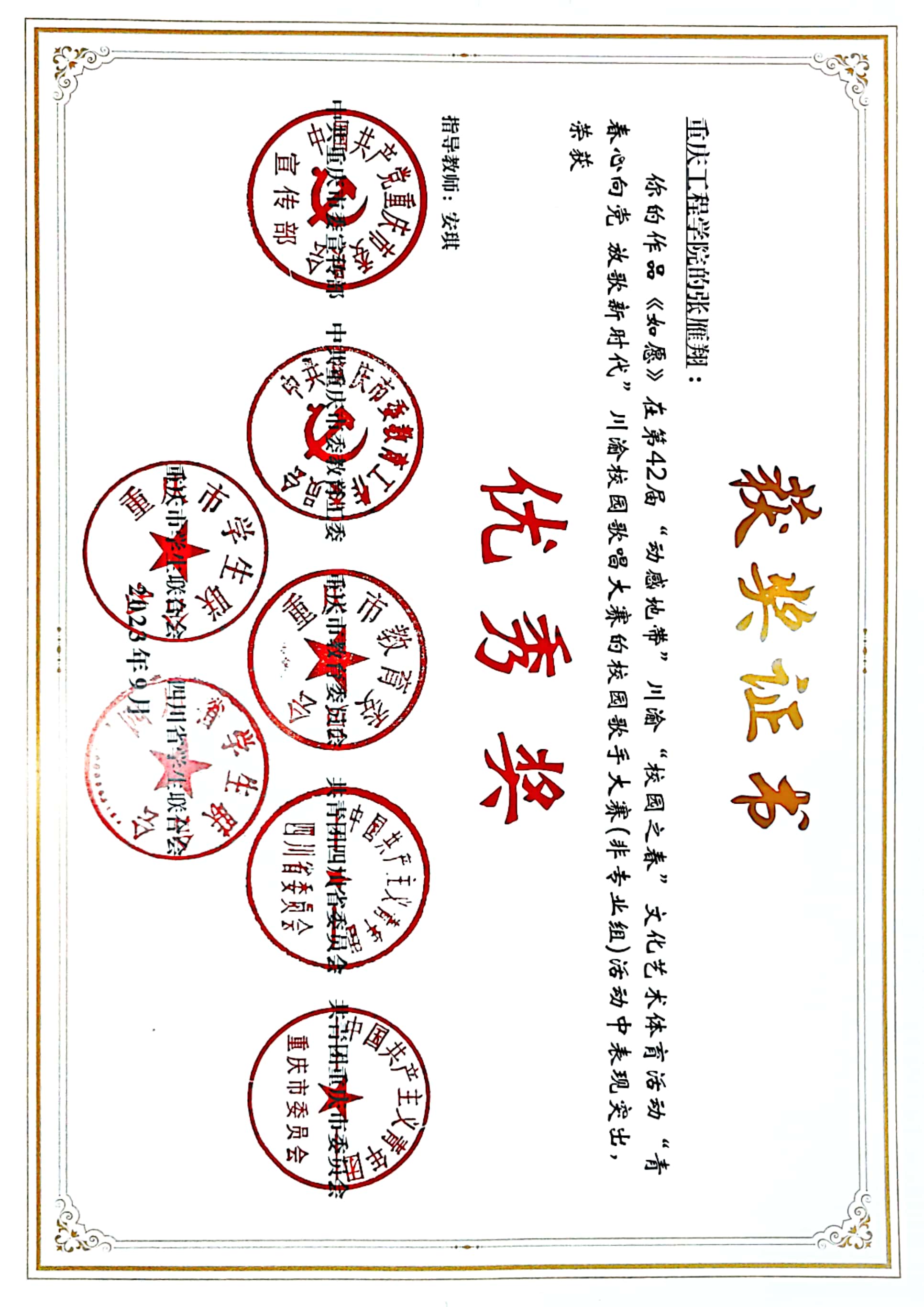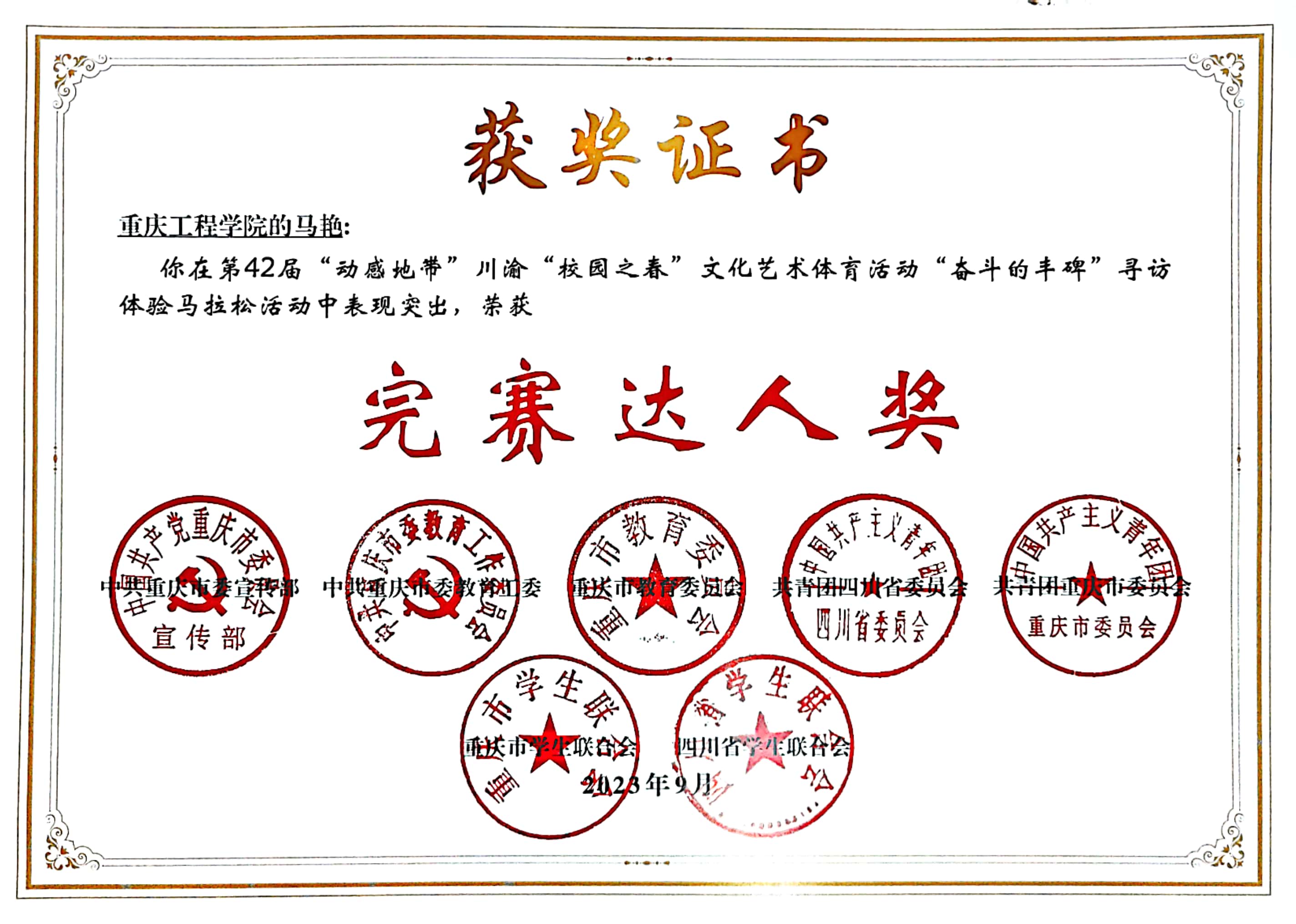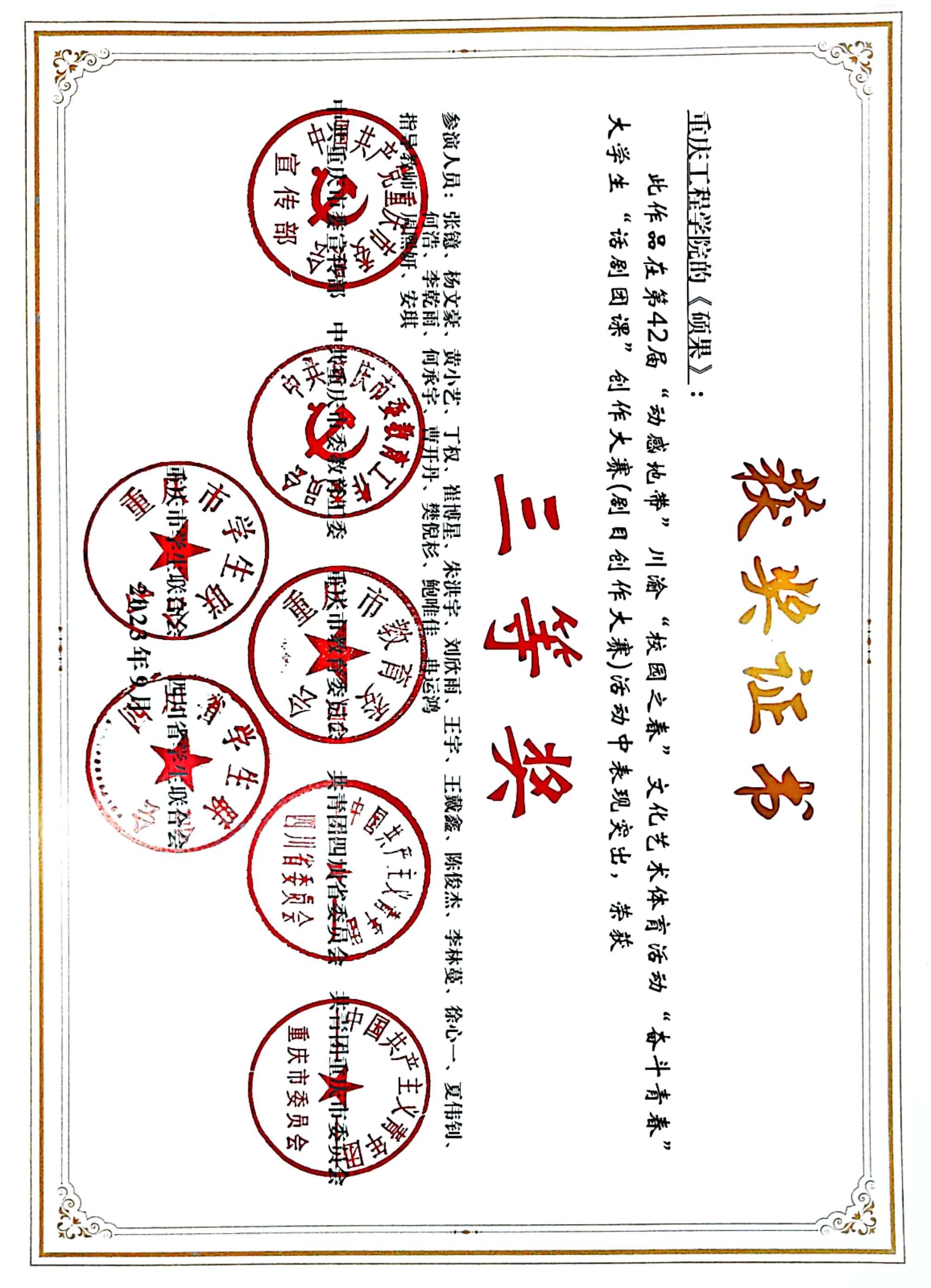 本网讯(文/图 校团委 张俊)近日,由中共重庆市委宣传部、中共重庆市委教育工委、重庆市教委、共青团重庆市委、共青团四川省委、重庆市学联、四川省学联联合举办的第42届“动感地带”川渝“校园之春”文化艺术体育活动进行了获奖情况公示。