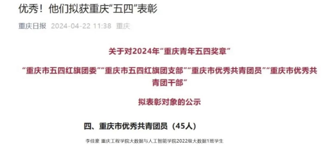 4月22日,重庆工程学院大数据与人工智能学院2022级大数据1班团支部书记李佳豪同学,凭借其出色的表现,拟获2024年“重庆市优秀共青团员”称号。