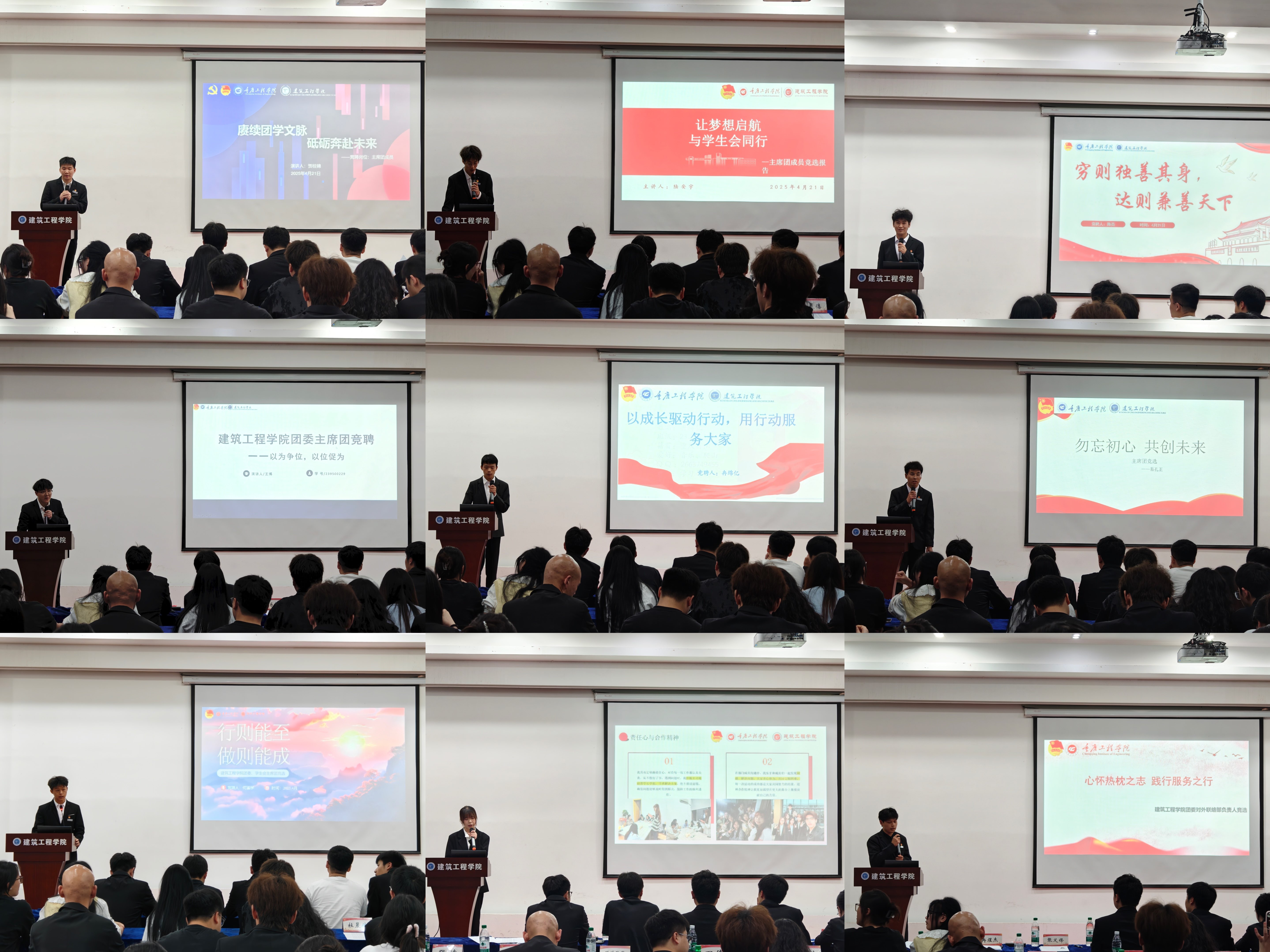 为进一步巩固并深化建筑工程学院团委、学生会工作,加强学生组织人才队伍建设,着力培养德才兼备的优秀学生骨干。建筑工程学院团委、学生会于 2025 年 4 月 21 日 18:30 - 21:30在建筑工程学院办公楼三楼多功能厅开展建筑工程学院第十届团委、学生会负责人竞聘会。此次竞聘会建筑工程学院分团委书记张徐宇,建筑工程学院团委、学生会全体成员参与,并邀请管理学院、软件学院、新媒体电商学院学生骨干代表出席。