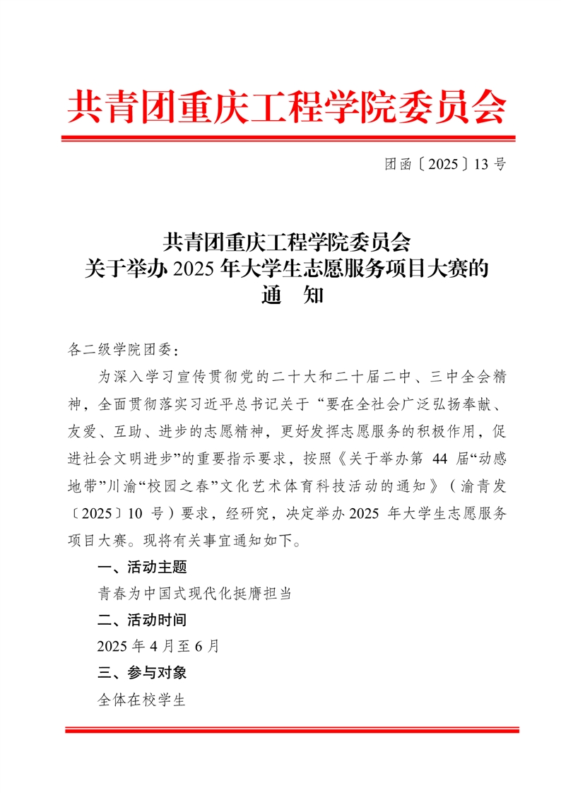 共青团重庆工程学院委员会关于举办2025年大学生志愿服务项目大赛的通知