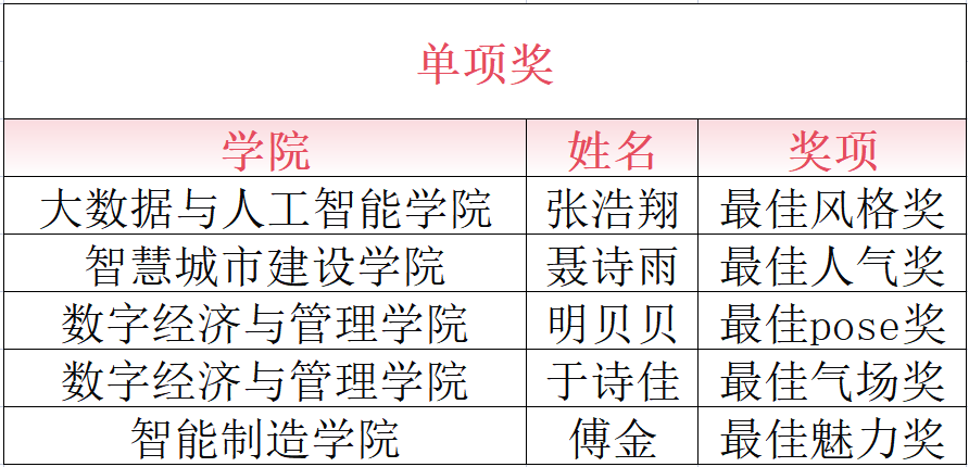 整场大秀还设置了三轮重磅抽奖,送出了不同金额以纯代金券及 65 份以纯定制牛仔包,获奖名单揭晓时全场欢呼不断。在同学们热情的期待中,颁奖环节开启,校团委及校企合作方负责人分别为获奖者颁奖,奖项兼顾个性与专业,既肯定了选手的多元魅力,也认可其综合实力,为 T 台秀画上圆满句号。获奖名单如下: