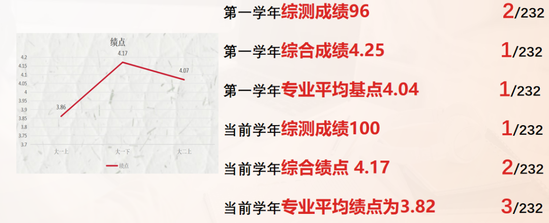 在校期间,荣获国家励志奖学金1次、学校优秀学生奖学金2次,大一综合绩点专业第一,大二综合绩点专业第二;党教中心助理,班级团支书,物理实验助理,大学生服务中心宣传部负责人,同心宣讲团成员;积极参加竞赛,在“泰迪杯”“计算机设计大赛”“物理实验竞赛”等比赛中斩获佳绩;荣获“三好学生”“创新能力先进个人”“艺术先进个人”等荣誉称号,累计荣获国家级奖项5次、省市级奖项6次、校院两级荣誉证书40余次;考取国家级职能证书3项,献血血浆超2000ml,志愿服务学时超900小时。