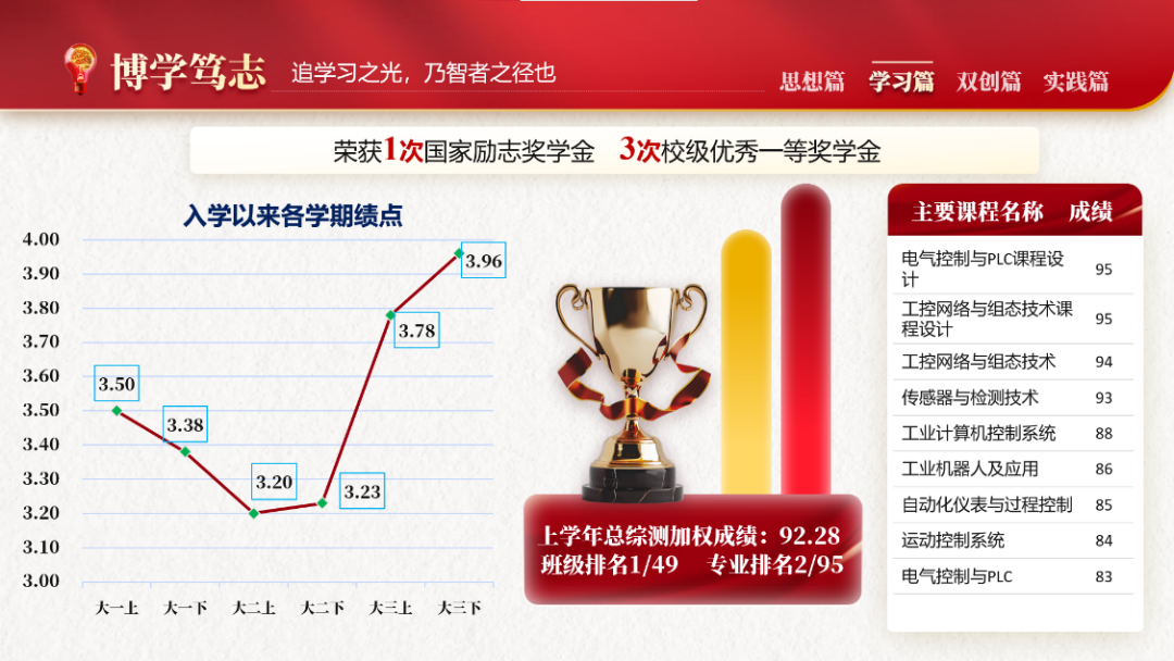 博学而笃志,厚积而薄发。自大一入学以来她一直严格要求自己,在学习上积极进取目标明确,上一学年加权成绩达92.28,综合成绩均排名专业前三,连续三年获得校级一等奖学金,获得2023年国家励志奖学金。同时她还将理论知识融入实践,积极参加课外竞赛,考取资格证书,在学习的道路上永无止境。