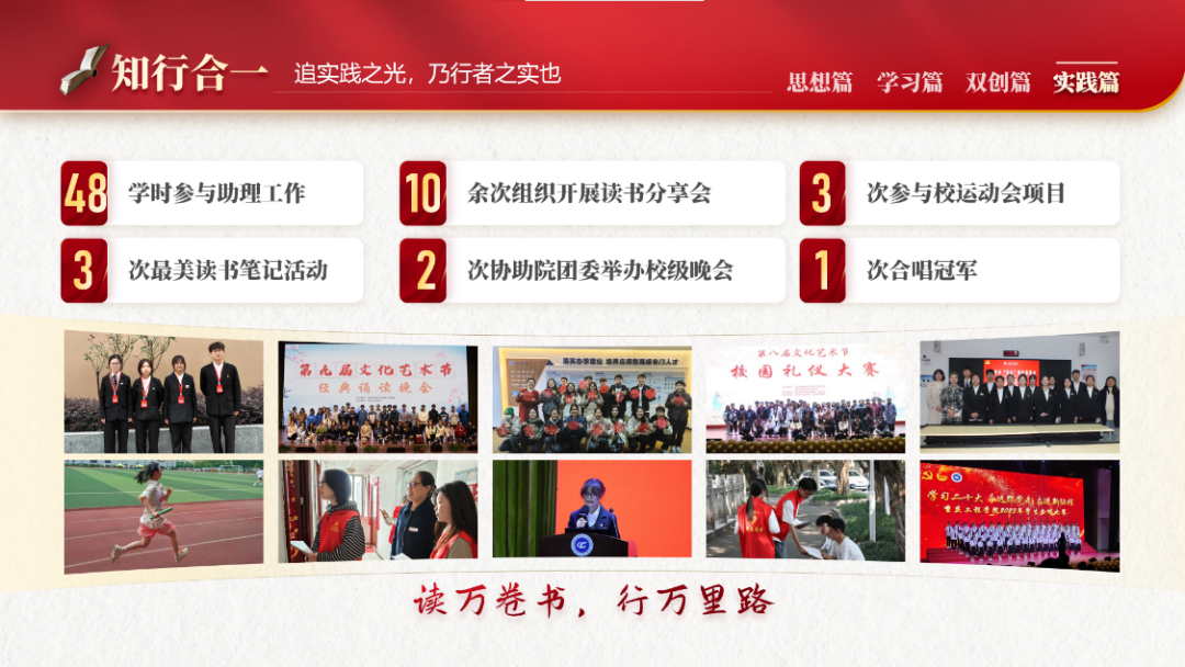 知行合一,以知促行,以行求知。在大学期间,她担任过班委、学生助理、学院学生会成员,从多方面锻炼自己,提升综合能力。同时作为新学院工作室的初创成员,和她的团队伙伴们在指导老师的共同努力下一起成立了“机器人与智控创新中心”,搭建交流平台,让未来的重工学子再创佳绩。她在学生会工作付出中感受到幸福与价值所在。秉持着为学院奉献、为老师同学服务的初心,在任期间组织活动30余场,参与人数超1000人次。