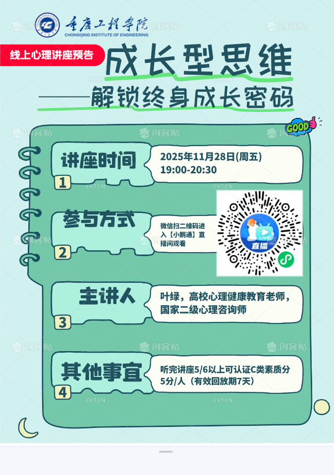 20251128日晚19:00-20:30,由心理健康教育与咨询中心主办的“成长型思维——解锁终身成长的密码”主题讲座通过小鹅通平台顺利在线举行。本次讲座特邀高校心理健康教师、国家二级心理咨询师叶绿担任主讲,旨在引导学生突破思维限制,掌握持续成长的密码,吸引了众多学生线上参与。
