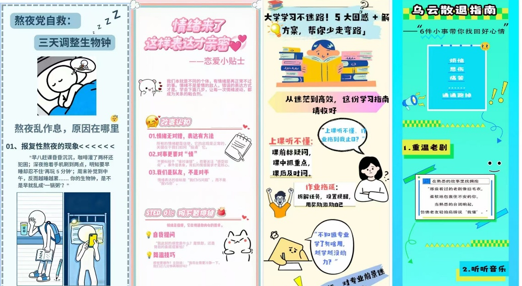 “暖心贴士”海报创作比赛让同学们围绕大学生学习、生活、就业、交友、恋爱等方面的心理困惑和成长烦恼展开,并自行给出针对性建议,每组作品上限为30个。最终共337个学生参与作品的制作,收集了233组作品。按照参赛作品总数的前10%进行评奖,共23组、28个学生获奖,奖金为50元/作品。海报创作在激发了同学们各种创新思维的同时,也让同学们对自身成长的问题与烦恼有了更清晰的认识,帮助他们提高了问题解决能力。