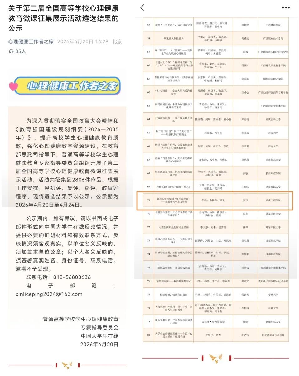 此次入选,是我校持续深化大学生心理健康教育工作、推动心理健康教育数字化资源建设的重要成果,也展现了我校师生在心理健康教育领域的专业素养和创作能力。学校将以此为契机,进一步鼓励师生参与高水平素质教育类竞赛,不断提升心理育人实效,助力学生健康成长。