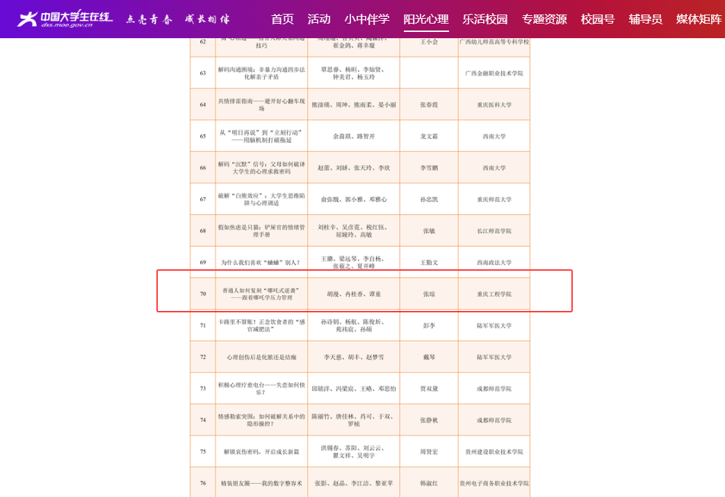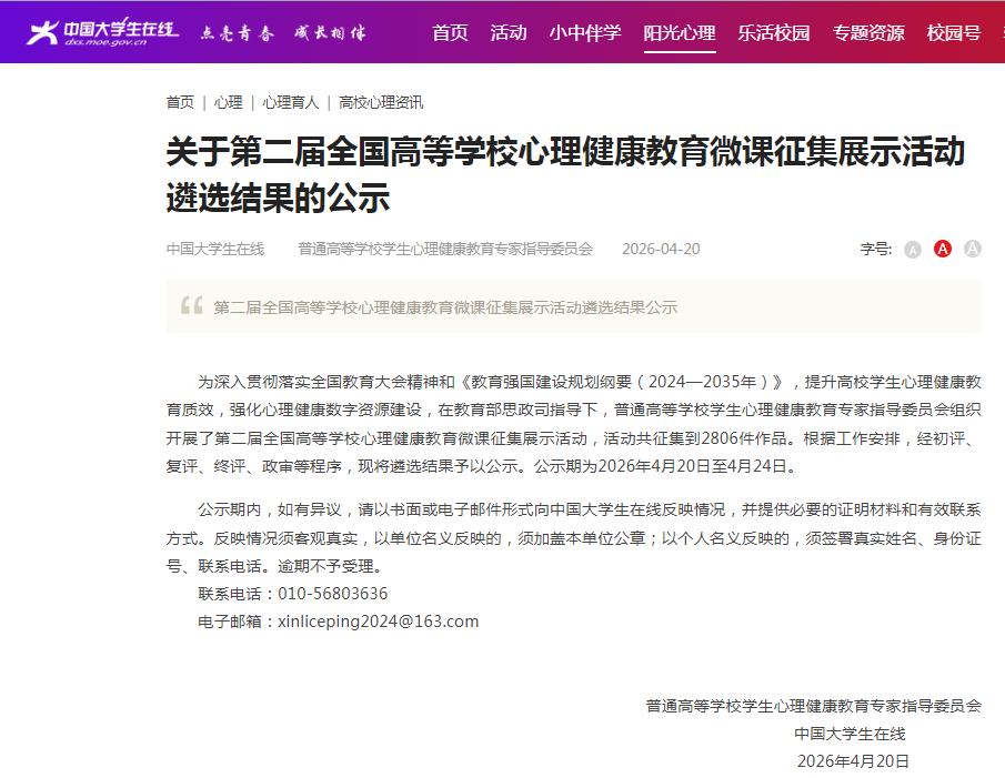 近日,由教育部思政司指导、普通高等学校学生心理健康教育专家指导委员会主办的“第二届全国高等学校心理健康教育微课征集展示活动”完成遴选工作,中国大学生在线对结果进行了公示。我校师生团队创作的心理健康教育微课作品《普通人如何复刻“哪吒式逆袭” ——跟着哪吒学压力管理》成功入选公示名单。