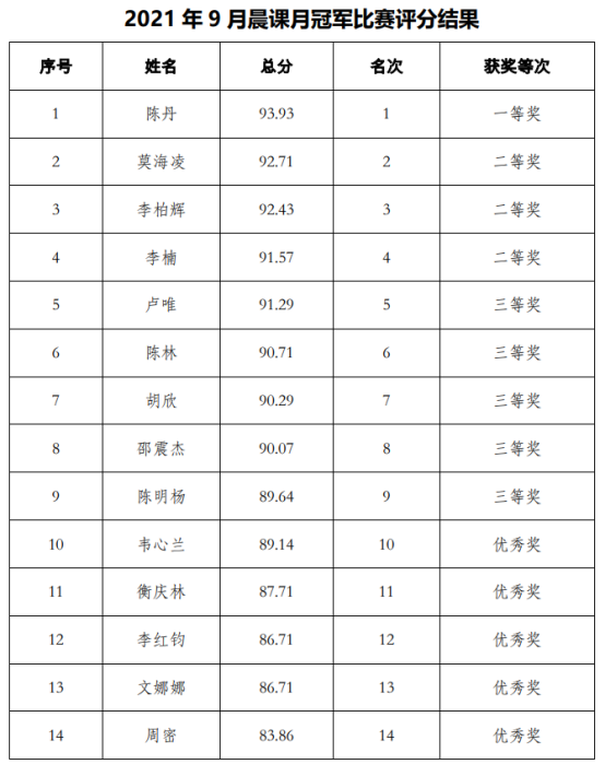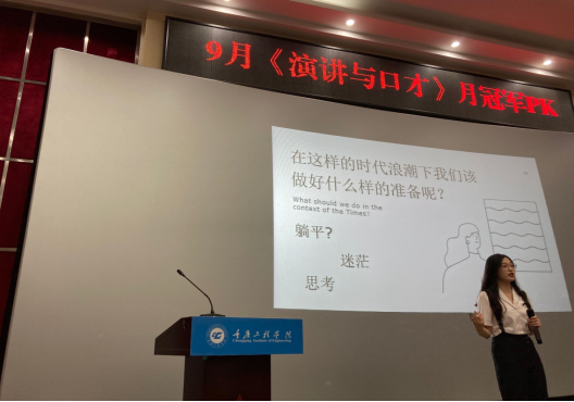 本网讯(文/图 大学生素质教育中心)2021年9月26日下午,大学生素质教育中心在行政楼阶梯报告厅举行了9月晨课演讲月冠军决赛。本次决赛邀请到了大学生素质教育中心邹春霞教授、刘皓月老师、优秀学生代表担任评委,本次参赛选手由各二级学院推荐院级比赛中的前两名同学组成。