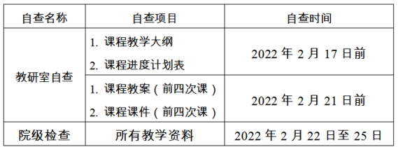 各教研室根据《课程教学大纲编制指导意见》(渝工程院教〔2020〕39号)、《本科教学主要环节质量标准》(渝工程院教〔2021〕56号)文件中教学资料质量标准对2021-2022学年第二学期开设课程的教学资料分两批进行自查。具体自查时间安排如下: