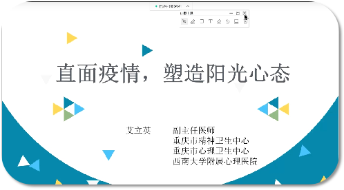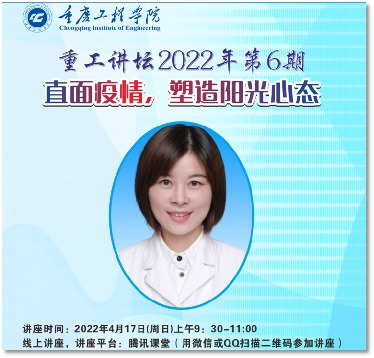 本网讯(图/文 大学生素质教育中心)面对新冠疫情的反复,为增加大学生的心理资本,进一步帮助大学生做好科学的心理防护,2022年4月17日上午,大学生素质教育中心邀请了重庆市精神卫生中心艾立英医生做客“重工讲坛”,为我校师生带来了一场题为“直面疫情,塑造阳光心态”的心理讲座,帮助大家做好疫情期间的心理防护。