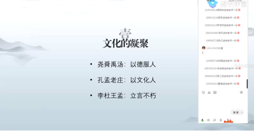 顾老师通过以德服人、以文化人、立言不朽三个方面来体现文化的凝聚。在此过程中,顾老师举了解缙、纪晓岚、杜甫、王维等历史名人的例子,通过这些有趣的例子来说明诗歌的影响力和作用之大,它既可以当饭吃,也可以救命。