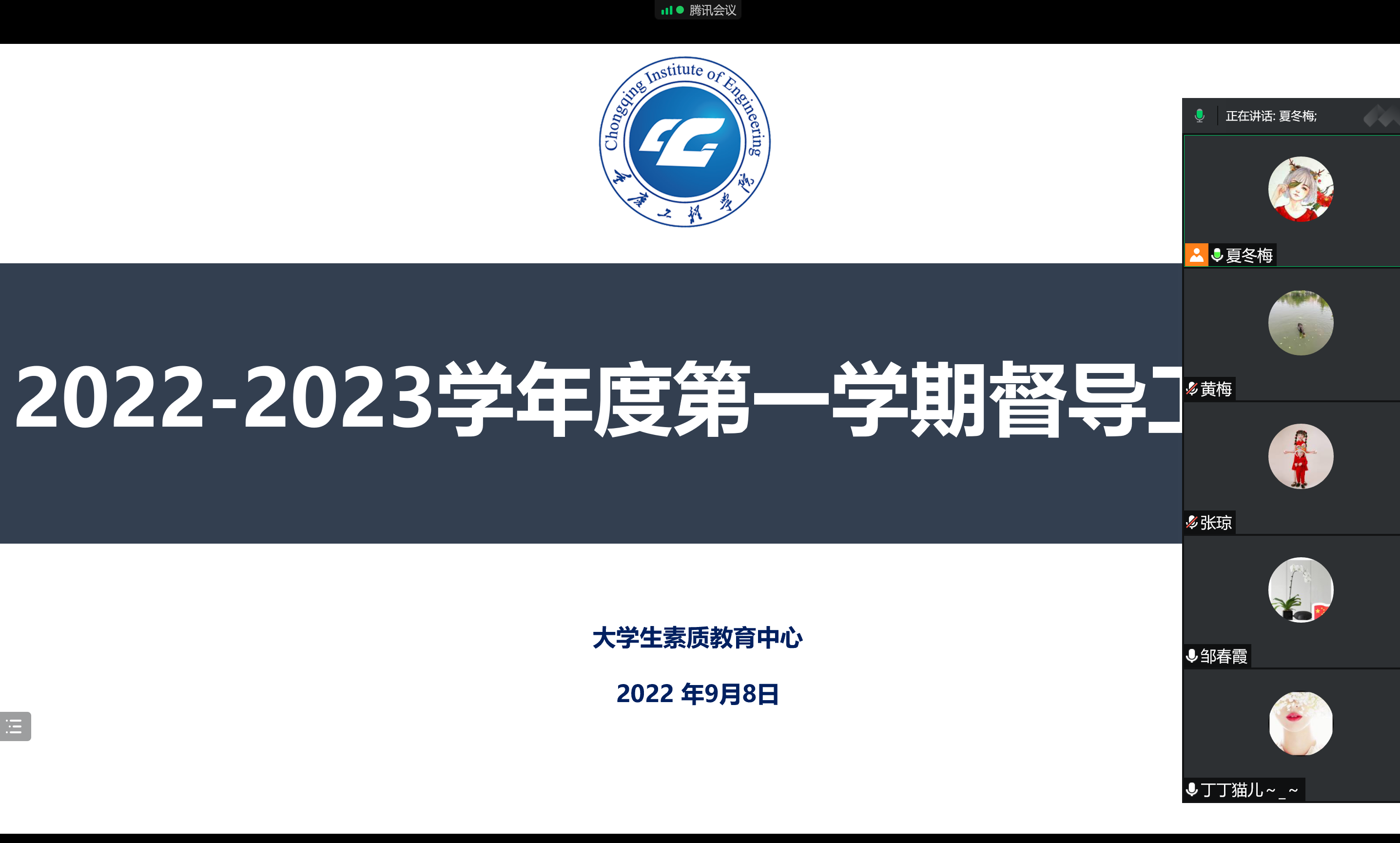 2022年9月8日14:00大学生素质教育中心召开2022-2023年第一学期教学督导工作会,安排部署了本学期教学督导工作,并总结线上教学开展情况。督导对象覆盖学院全体上课教师,重点关注教师教学平台的运用和学生课堂参与度,对课堂教学效果、学生出勤率、教师线上教学活动开展以及学生互动讨论等教学运行状况进行实时动态监测,收集线上教学信息,对反映出来的网络卡顿、师生互动少等问题及时给与反馈和解决,切实保障线上教学有秩序、教学质量不打折。面对疫情形势,大学生素质教育中心将持续贯彻落实以学生为中心的理念,加强线上教学过程管理与质量监控,进一步加强信息技术与课堂教学的有机融合,推动线上教学高质量发展。