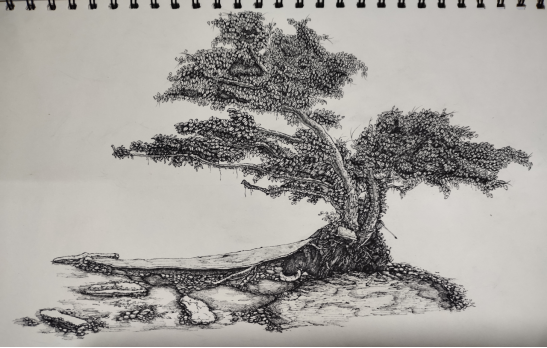 作品简介:创作于寒假,这幅图片,来自于抖音的一个短视频!这是一颗长在河道中央的树!任由雨季的冲刷!却依然顽强的生长着,所以这幅作品的命名为希望!一切皆有可能!