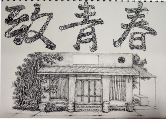 作品简介:创作于大二开学,这幅图片是我自己设计的一幅画!通过绿色植被形成致青春三个字!设计中有鲜花,有星球,有绿叶,有山脉,等。这就应该是象征着青春吧!下面画了一幅站点!象征着人生有很多个下一站!我们都在努力奔赴山海!努力前往下一站!