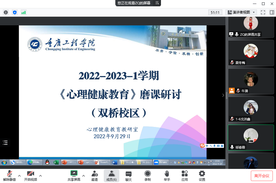 本网讯:为进一步加强《心理健康教育》课程建设,充分发挥课堂教学在学生心理健康教育中的主渠道作用,优化学生心理素质,促进学生健康成长,2022年9月29日15:00,大学生心理健康教育与咨询中心开展了第2022-2023学年双桥校区线上磨课研讨活动。