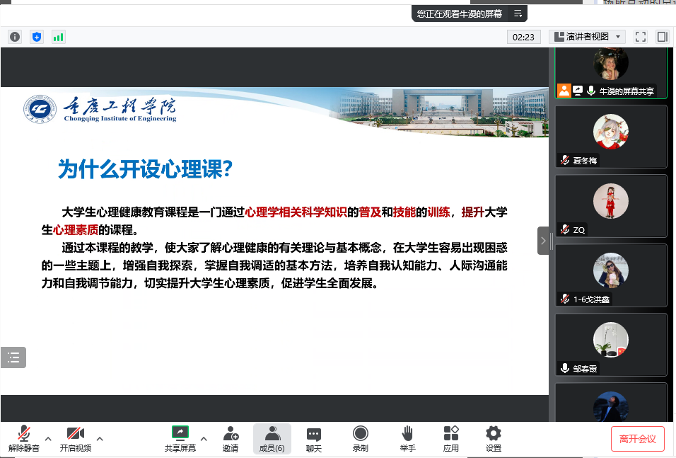 活动中牛漫、戈洪新老师分别讲解了《心理健康教育》导论课程。邹春霞、张琼、杨雷雷三位老师根据各自经验,出谋划策,反复推敲细节,对教学内容和教学环节进行了详细点评,并在大班互动教学活动设计等方面提出了意见。此次教研活动强化了中心教师的教学基本功,将教育理论转化为实践,强化了心理课程建设,提升了中心整体教学能力和教学创新。