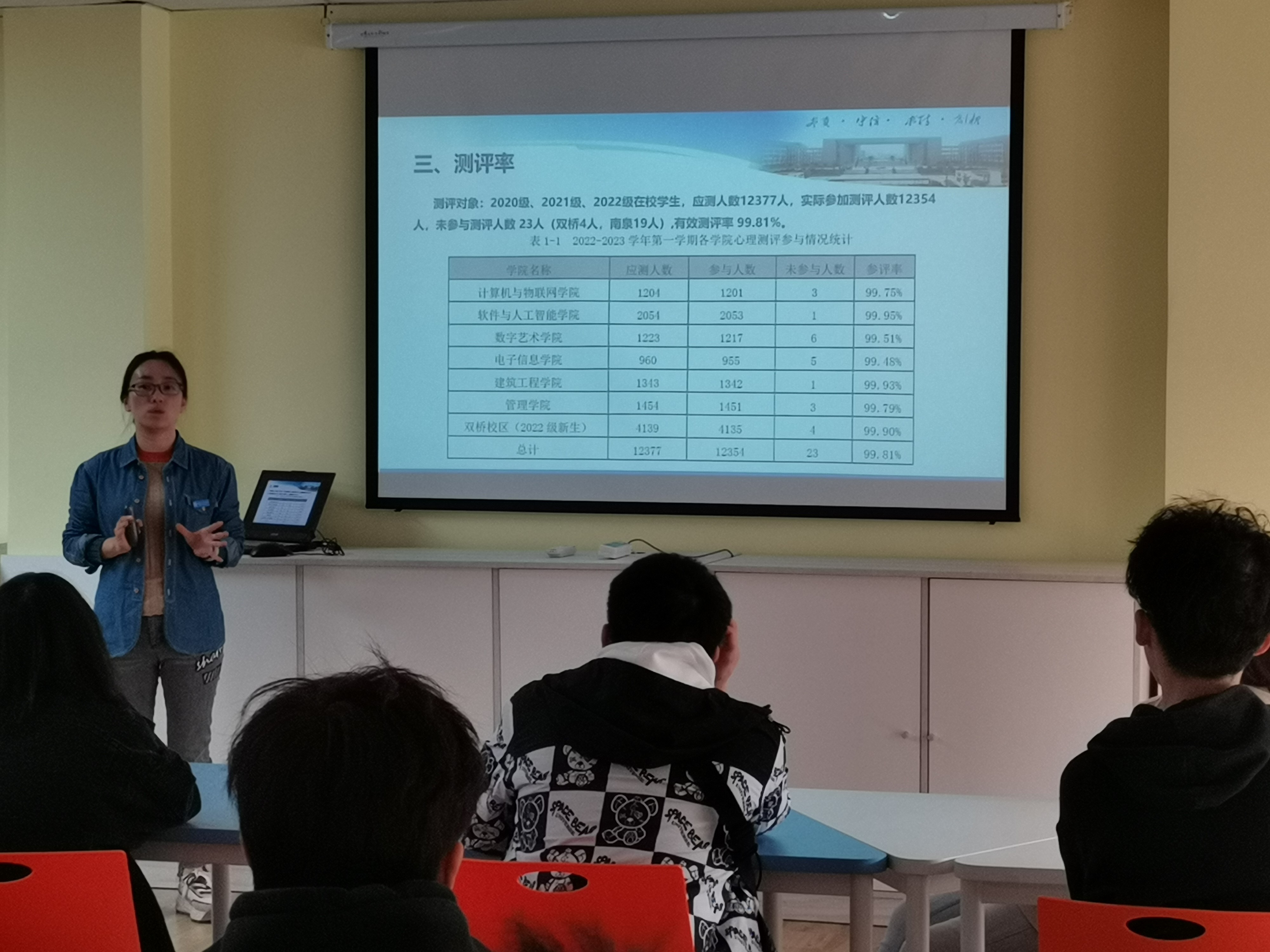 张琼老师就心理健康教育与咨询中心开学组织的心理普查情况进行了数据通报,并表示正是因为心理助教们的积极配合,积极动员同学们参加才有了现在99%的测评率的好成绩,对大家的工作进行了肯定。然后讲解了普查后心理测评的工作思路,并表示处于心理亚健康状态并不可怕,只要我们积极关注心理健康,端正态度,现在遭遇的低谷将会变成人生的财富。然后,对10·10世界精神卫生日的活动数据进行了通报,鼓励大家多多学习和研究,积极引导同学们参加活动,以此为契机去思考和感受,勉励大家在自己班上发光发热。最后,就心理健康教育课程进行了座谈会,调查了同学们对课程的评价以及需求,希望大家多提建议,更期待大家能在重工收获更多的成长。
