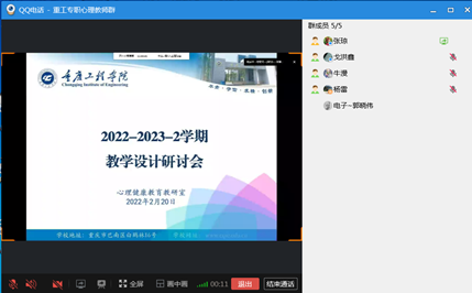 为进一步加强心理健康教育课程建设,落实《重庆工程学院全面提高教育教学质量与管理水平工作行动方案》(渝工程院〔2021〕20号),加强教师教学能力培养,切实提升教师教育教学水平和人才培养质量,将学校“四位一体”心理健康工作方案落到实处,2023年2月20日15:00,心理健康教育教研室结合线上线下举行了第2022-2023-2学期教学设计研讨会,会议由张琼老师主持。