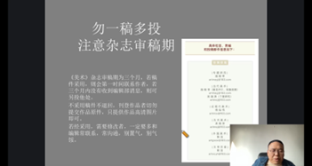 本网讯(图/文 大学生素质教育中心)为进一步加强校园文化建设和大学生素质教育,激发学生对于心理学的了解与大学生心理调节的思考,3月29日中午,大学生素质教育中心邀请到了中央美术学院美术学博士吴端涛教授通过小鹅通直播平台为全校各专业学生开展题为“期刊论文写作与投稿一一以《美术》杂志为例”的专题讲座。吴教授现任中国美协《美术》杂志编辑部主任,中国美协美术理论委员会学术秘书,中国美术家协会会员中国文艺评论家协会会员,山东师范大学客座教授,山东艺术学院特聘研究员。研究方向主要为近现代美术史、美术思潮,全真教艺术史。论文多篇发表在《美术研究》《美术》及《人民日报》等核心报刊。个人获第63批中国博士后科学基金1等面上资助。论文获中国美协主办的“新代中国美术理论建设——第二届青年美术论坛”入会资格奖(最高奖)、“全国美术高峰论坛·上海”入会资格作品奖(最高奖)。专著《蒙元时期山西地区全真教艺术研究》由文物出版社出版;专著《西行美术家研究·董希文》(2023年底出版)入选“十四五”时期国家重点出版物出版专项规划(社会科学与人文科学出版规划艺术项目)。