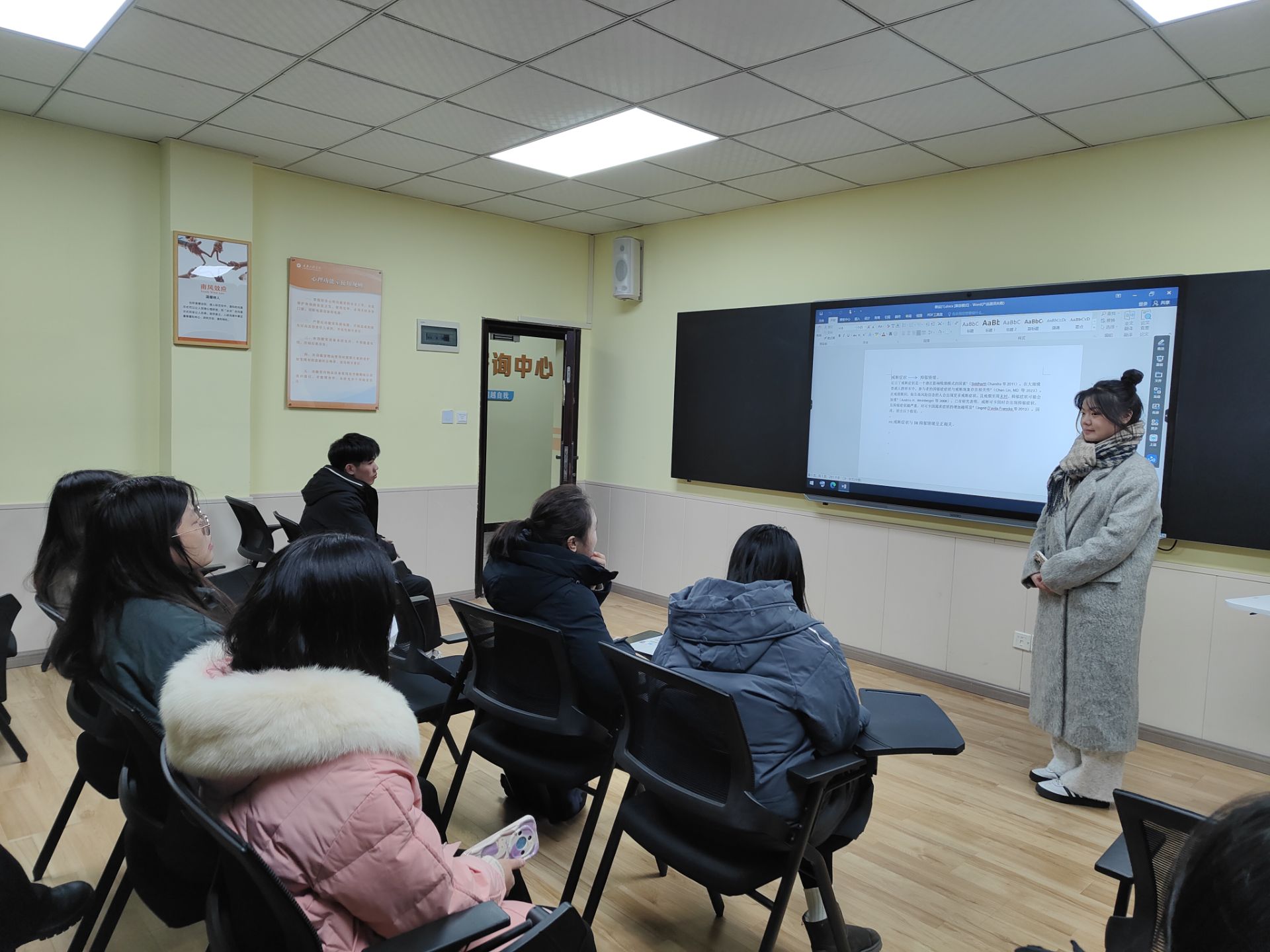 会议上,马阳同学就自身观察到了失独者这一群体,从狭义的方面为大家讲解了其意思,并且以体育馆坍塌这件事件来举例说明失独者这一群体的特殊性以及广泛性。主要从“精神健康问题,社会边缘者,无广大范围关注,影响力低下”等相关问题做出自我简介,学生助理也对其进行了热烈讨论。